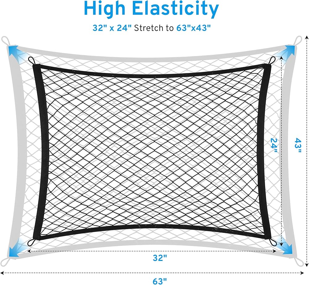 The trunk netting for cargo can start from a compact 32" x 24" and extend to 63"x43" .The risk of goods falling due to bumps or accidents during transport is reduced, minimizing the chance of cargo loss.