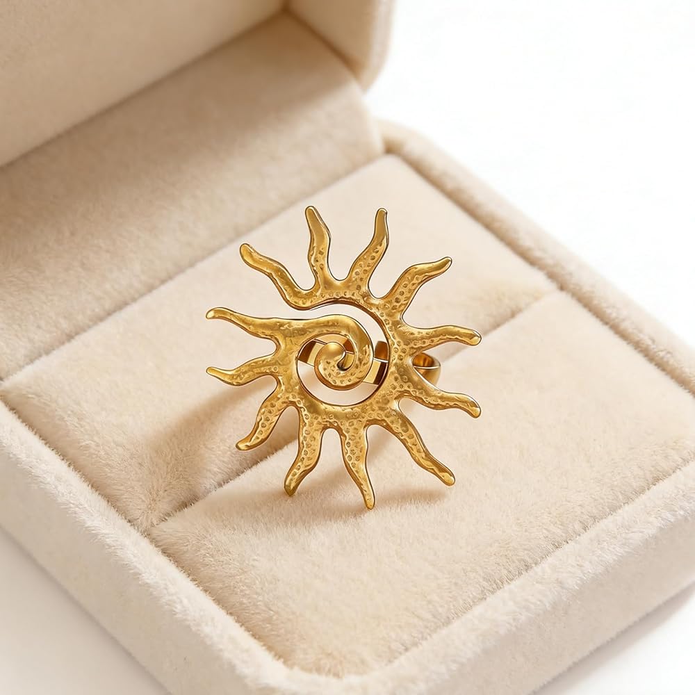 [Material and Craftsmanship]Crafted with meticulous care, this ring is made from quality stainless steel that ensure durability and a luxurious finish, creating an accessory that not only complements your style but also endures daily wear.The incorporation of the sun motif in gold exudes a sense of grandeur and opulence, making this ring a standout accessory that brings a touch of celestial charm to your everyday attire