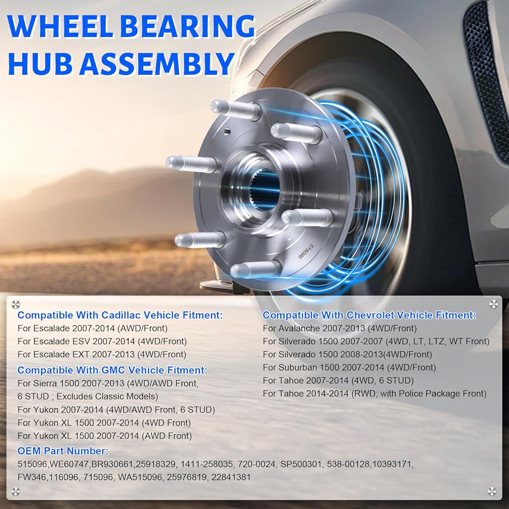 Vehicles Fitment: Hub assembly Compatible with Cadillac Escalade ESV 2007-2014, fit for Cadillac Escalade EXT 2007-2013 , fit for Chevy Silverado 1500 2007-2013, fit for GMC Sierra 1500 2007-2023, fit for GMC Yukon 2007-2014, fit for GMC Yukon XL 1500 2007-2014