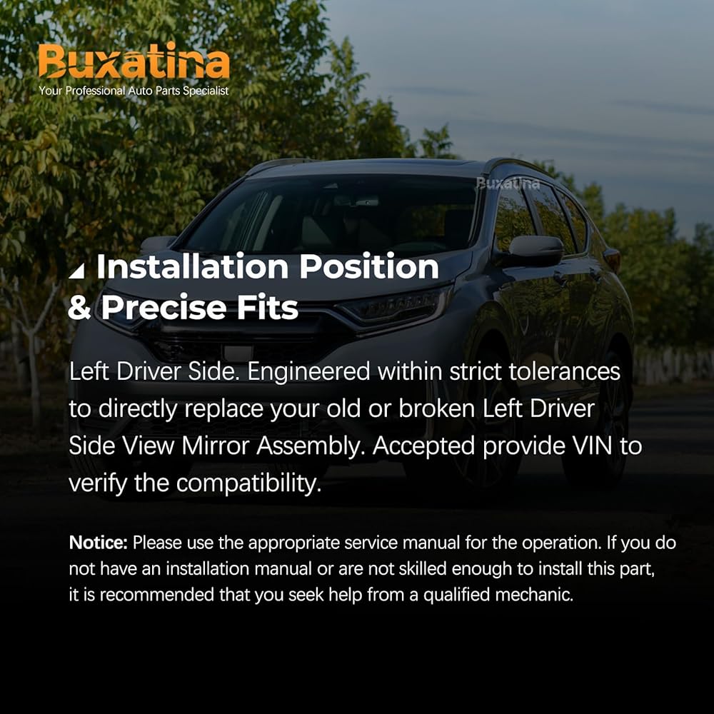 【INSTALLATION POSITION & PRECISE FITS】 Left Driver Side. Engineered within strict tolerances to directly replace your old or broken Left Driver Side View Mirror Assembly. Accepted provide VIN to verify the compatibility. Notice: Please use the appropriate service manual for the operation. If you do not have an installation manual or are not skilled enough to install this part, it is recommended that you seek help from a qualified mechanic
