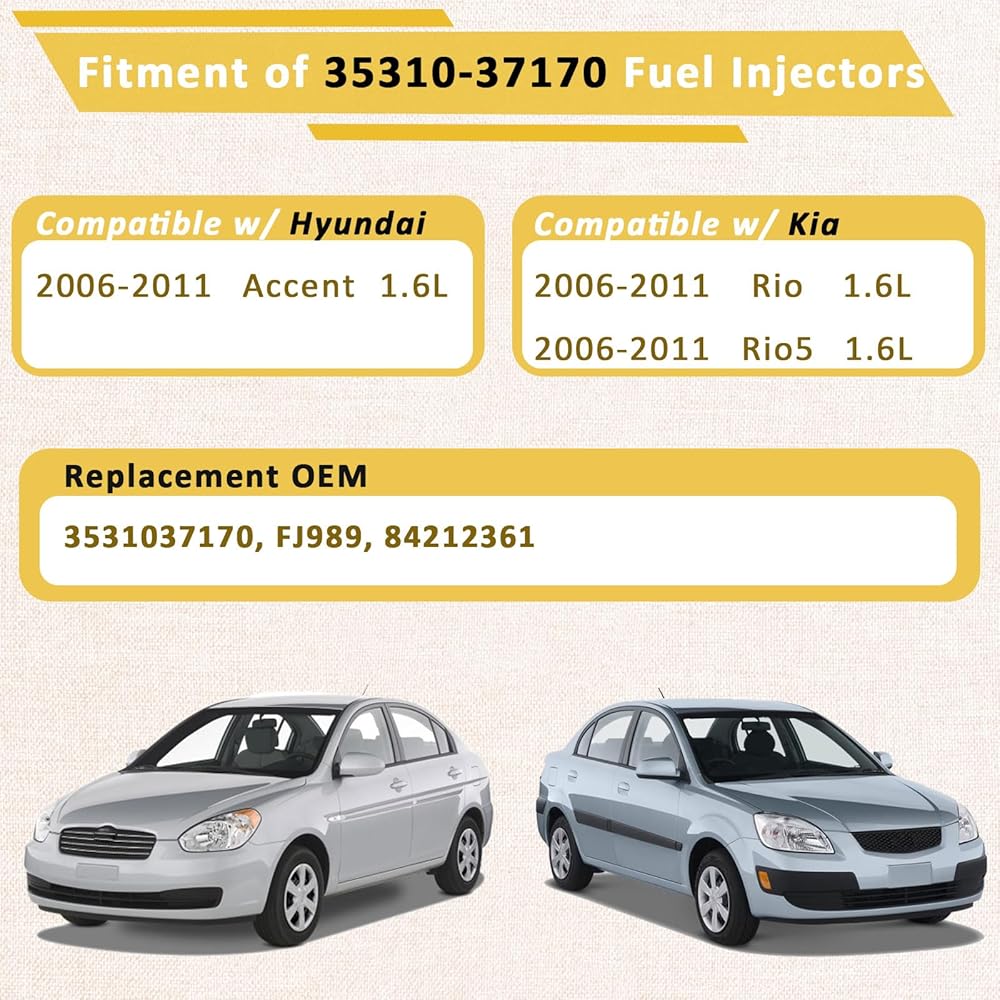 [Fitment] - 2006-2011 G4-Motor 1.6L Accent & Rio Rio5 Fuel injectors,Offer long-lasting performance. You can expect the right fit and performance from our auto parts.