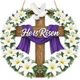 Celebrate the true meaning of Easter with this beautiful He Is Risen Easter wreath. Designed with a rustic wooden cross, blooming white lilies, a dove symbolizing peace, and a purple cloth representing Christ's sacrifice, this wreath is a powerful expression of faith and renewal. Crafted from premium wood with a smooth, durable finish, this Christian Easter door hanging features a layered design that adds depth and elegance. Lightweight yet sturdy, it's easy to hang on front doors, walls, or windows. Perfect for faith-filled homes, churches, or Easter gatherings, this wreath warmly welcomes guests while proclaiming the message of resurrection and hope. Add timeless beauty and spiritual meaning to your Easter decorations with this faith-inspired piece.