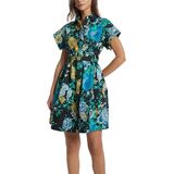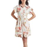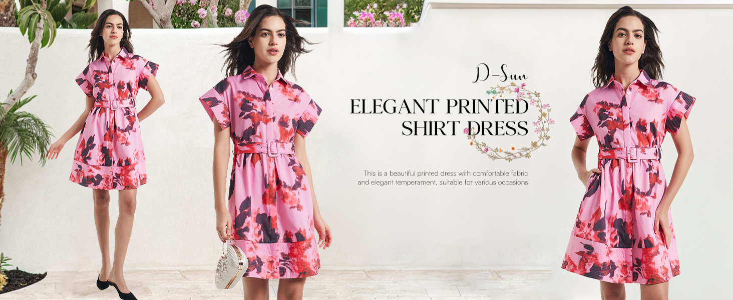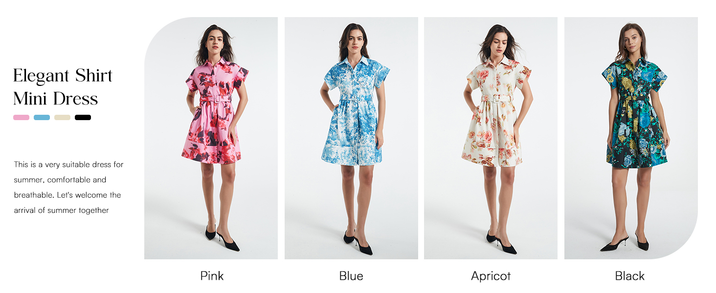 Feature:Button down,v neckline,short wing sleeves,spread collar, adjustable belt,stitching details on sleeves and hemline,side pockets,floral printed,mini length.Simple structured,but elegant and intellectual