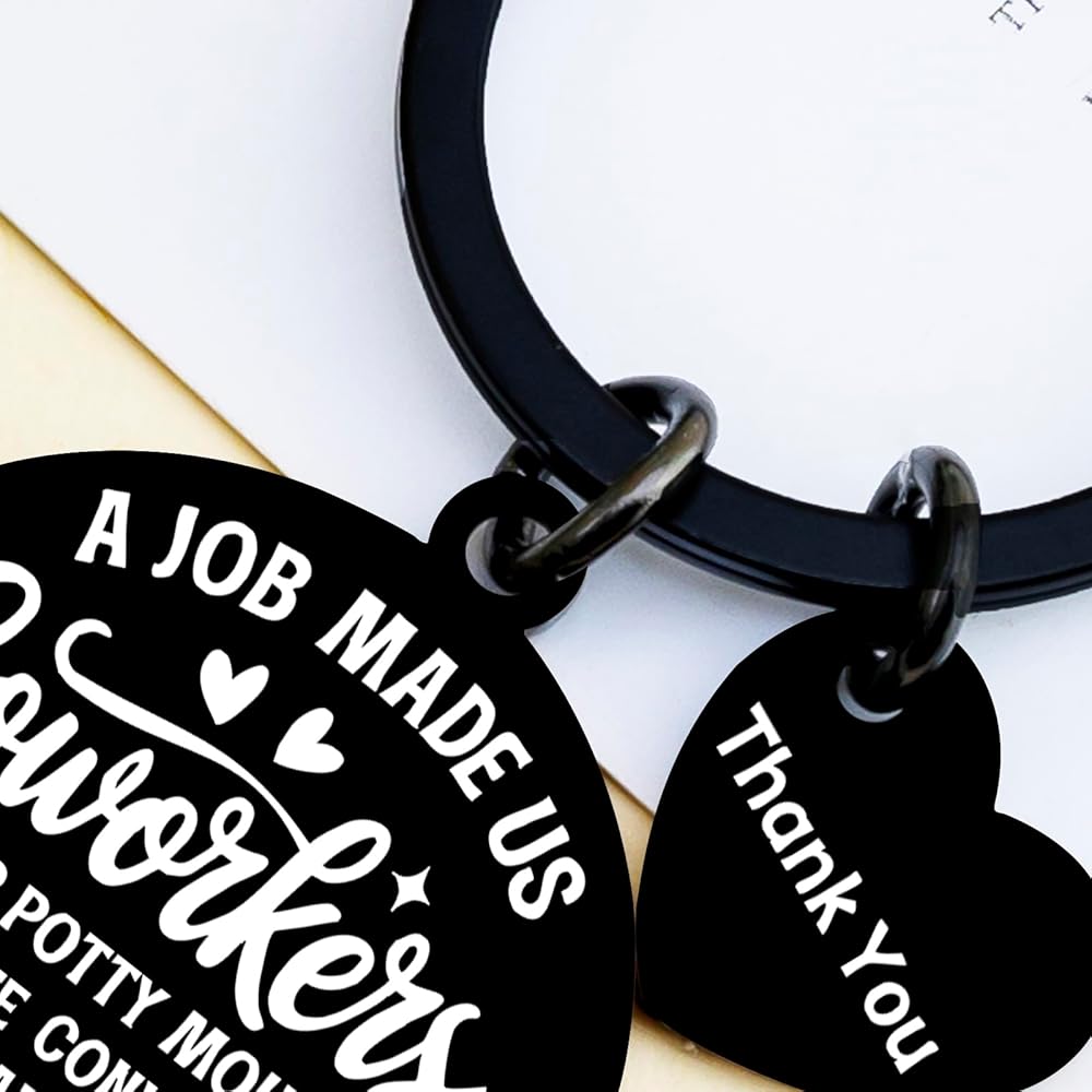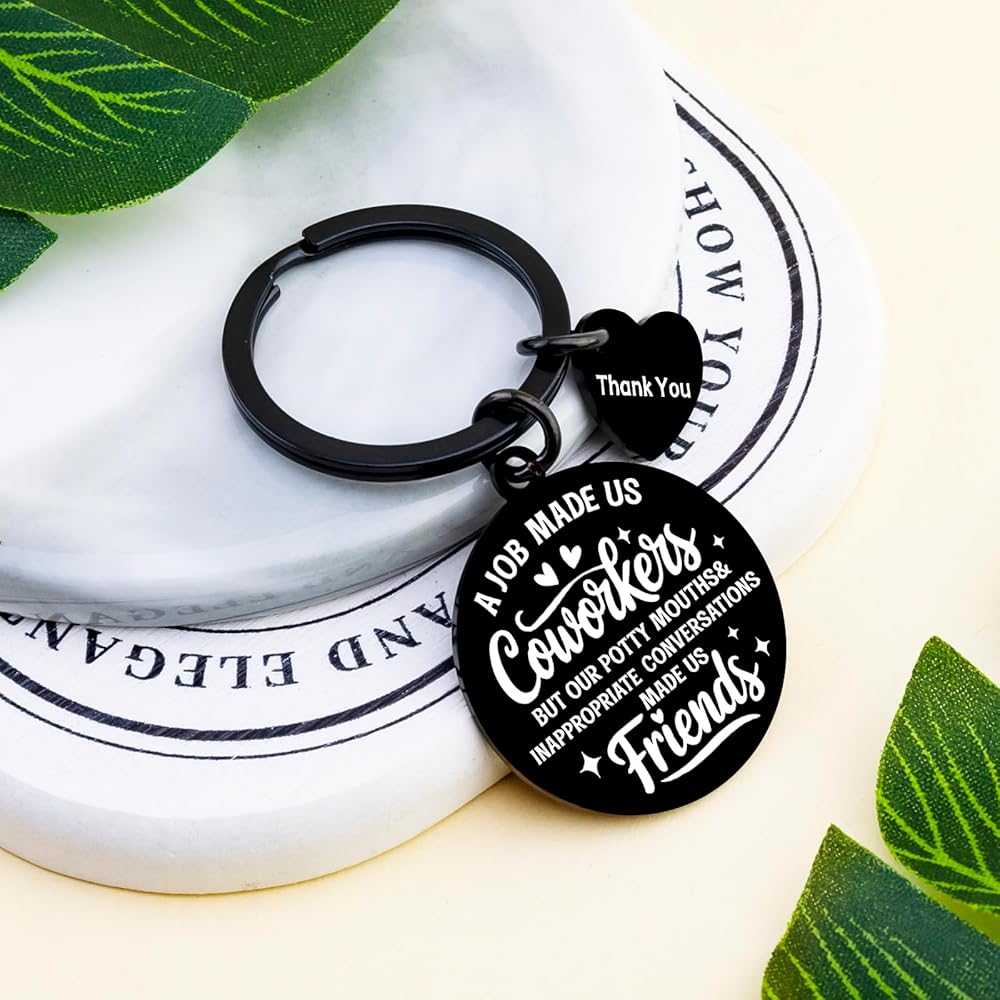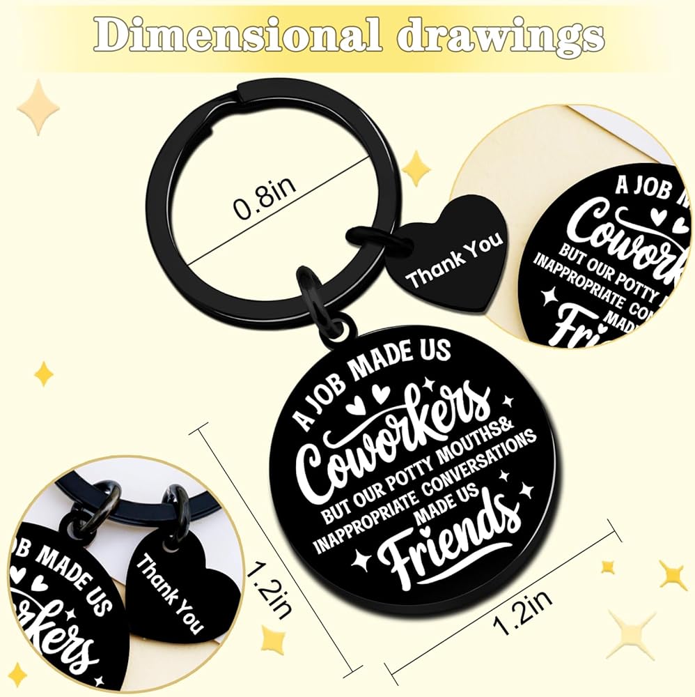 The keychain features a humorous yet heartfelt English phrase engraved on the front: “A job made us coworkers, but our potty mouths & inappropriate conversations made us friends.” Paired with a “Thank You” heart pendant, it conveys sincere gratitude and appreciation for workplace companions through lighthearted banter.