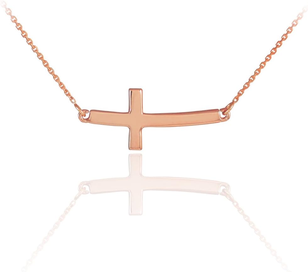 Celebrate your faith with this gorgeous genuine 14 karat rose gold sideways cross necklace from Claddagh Gold! This stunning style features a thin rolo chain attached to both ends of the sideways curved cross. This devout adaptation of a traditional bar necklace features a simple cross pendant set horizontally, suspended on a rolo chain necklace in your choice of 16", 18", 20", or 22" lengths. The necklace fastens securely with a spring ring clasp. Feminine and classic, this stunning style is a timeless treasure she'll enjoy wearing every day, or wearing to special events like a baptism, wedding, or Christmas service. This necklace is the perfect combination of faith and fashion.