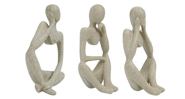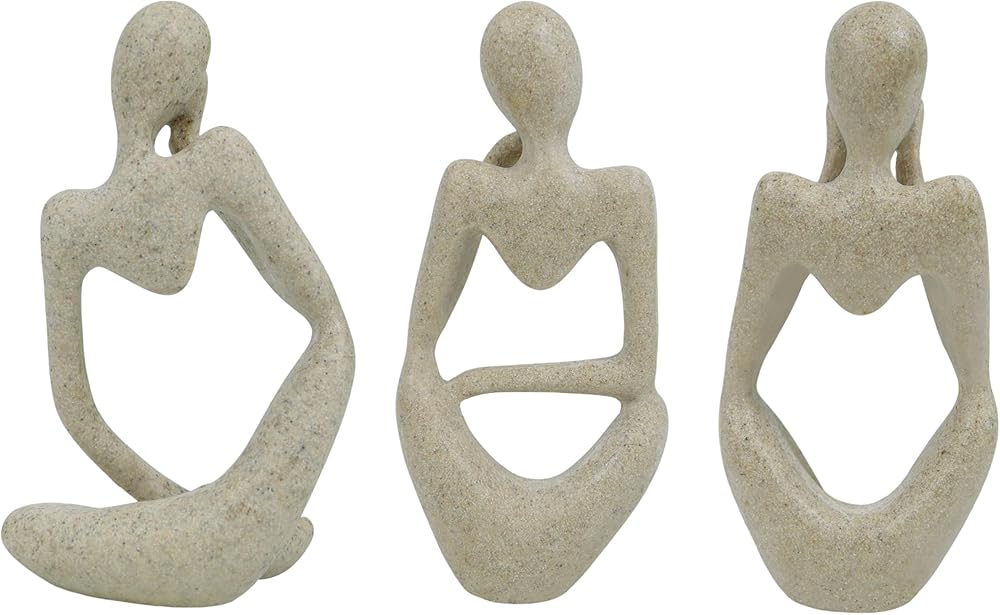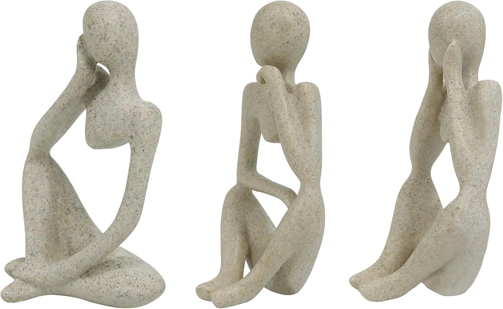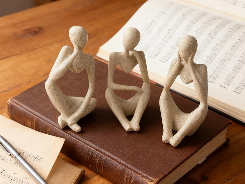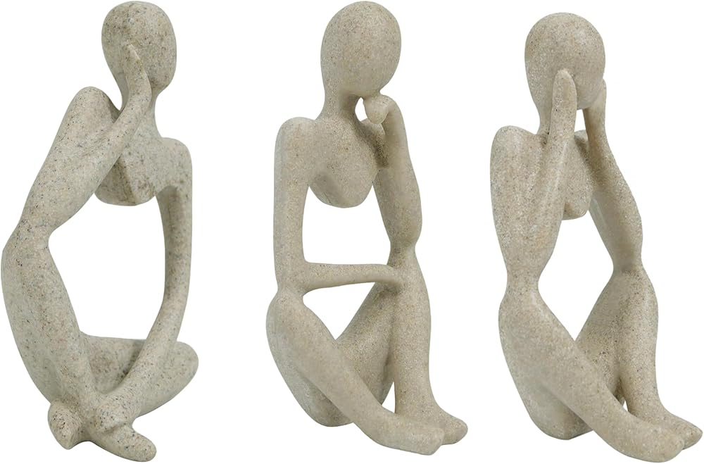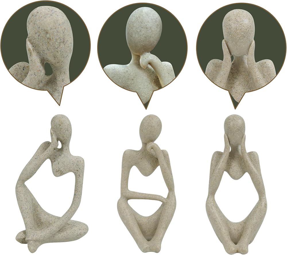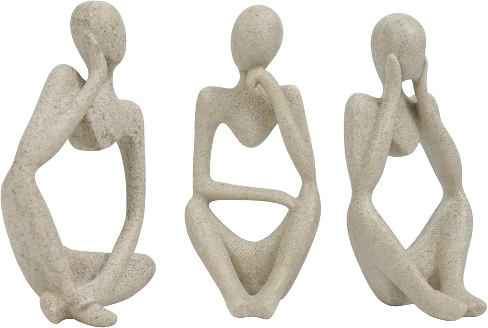 Three Unique Sitting Thinker Sculptures – Includes 3 abstract sandstone resin figurines, each approx. 5″ tall, perfect for artistic decoration on shelves, desks, mantels, bookcases, or side tables.