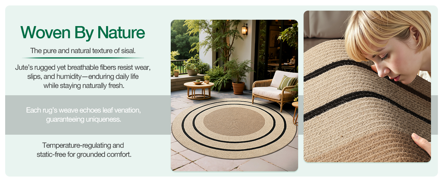 Natural & Breathable: Made from soft yet durable jute fibers, this rug promotes air circulation to help prevent moisture buildup underneath. Its breathable structure keeps floors fresher while adding a warm, organic feel to your space