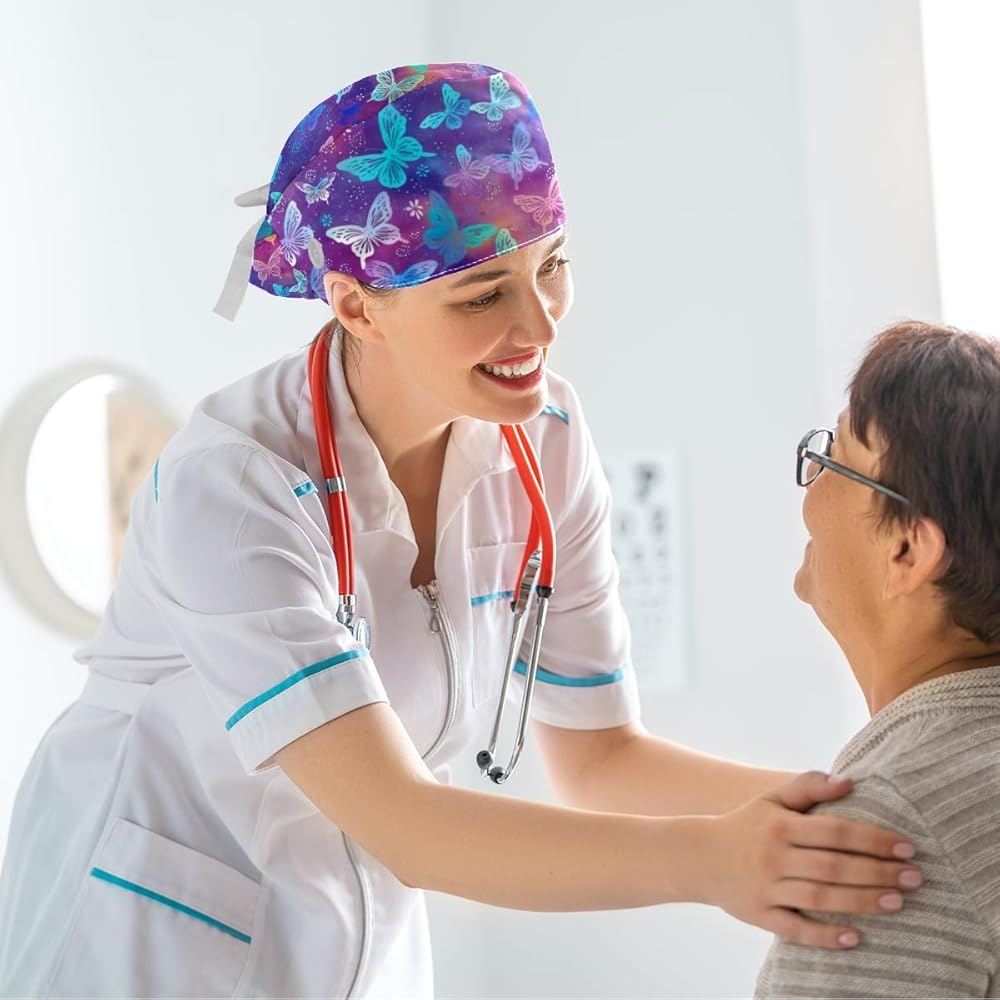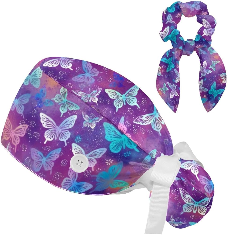 Scrub Caps Women, Surgical Caps with Buttons, Ponytail Nurse Hat, Bouffant Scrub Hats with Hair Scrunchy Adjustable, Butterfly Cartoon Purple and Blue Vintage Retro Cute