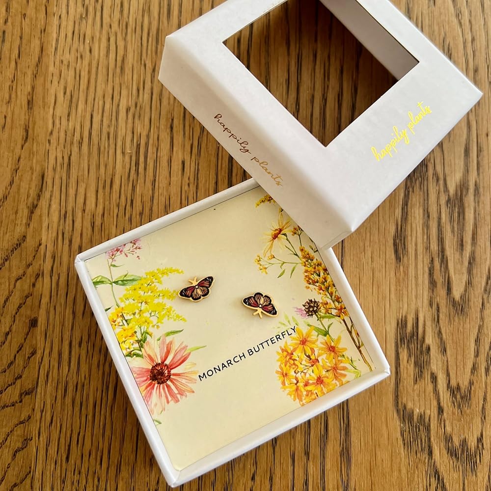 Capture the vibrant beauty of nature with our exquisite Monarch Butterfly Earrings. These stunning 18K gold-plated butterfly stud earrings are designed to celebrate the iconic elegance of the Monarch butterfly, a symbol of endurance, change, and life's beautiful journey. Each earring is crafted with remarkable detail, showcasing the intricate patterns of the Monarch's wings. They offer a touch of whimsical elegance perfect for any occasion. Whether you are an admirer of butterfly jewelry or searching for a unique piece of nature-inspired art to wear, these studs are a beautiful tribute to the delicate wonders of the natural world. Designed for comfort, these lightweight earrings are made with a durable stainless steel base and are safe for sensitive ears, allowing for a pleasant, worry-free wearing experience all day long. Their secure fit ensures they stay in place, adding a graceful accent to your daily style or evening attire. Presented in a beautiful, ready-to-gift box, these gold butterfly stud earrings are a thoughtful present for any nature lover in your life. Celebrate a special moment or simply show your appreciation with a timeless piece of butterfly stud jewelry.