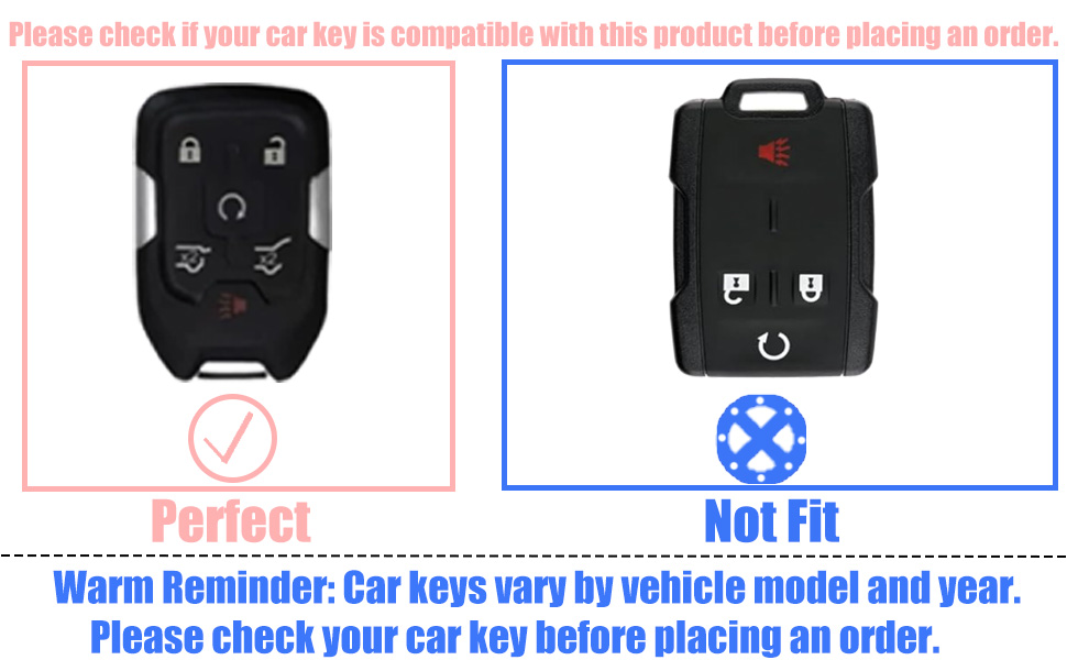 Fits Key Model: The key fob cover is compatible with Chevy Chevrolet Suburban Tahoe GMC Terrain Yukon Yukon XL 6 buttons smart key. The model is only for reference, please DOUBLE CHECK your key shape and button labels carefully to make sure it is the same as the second picture.(NOTE: same brand car may have different car key model.)