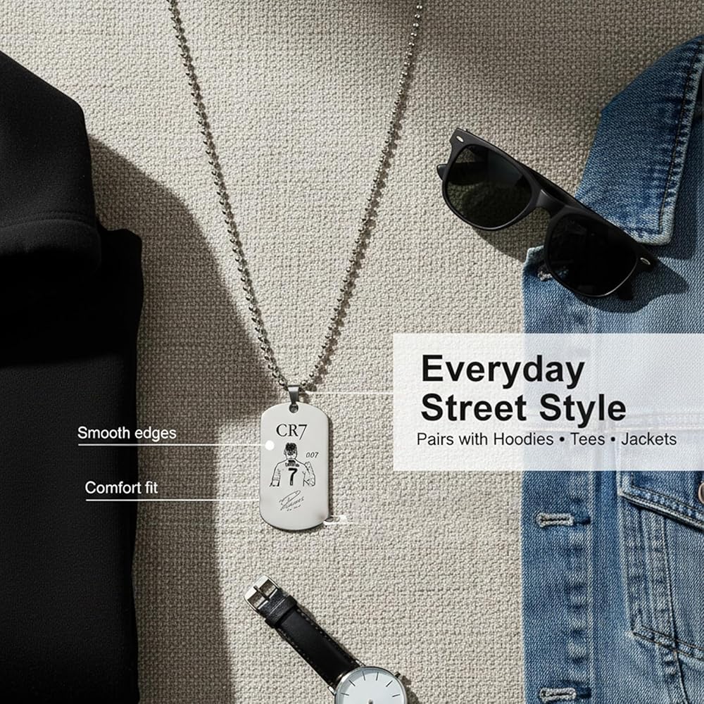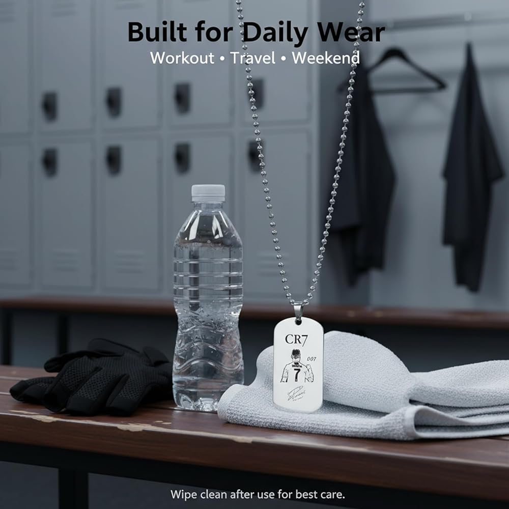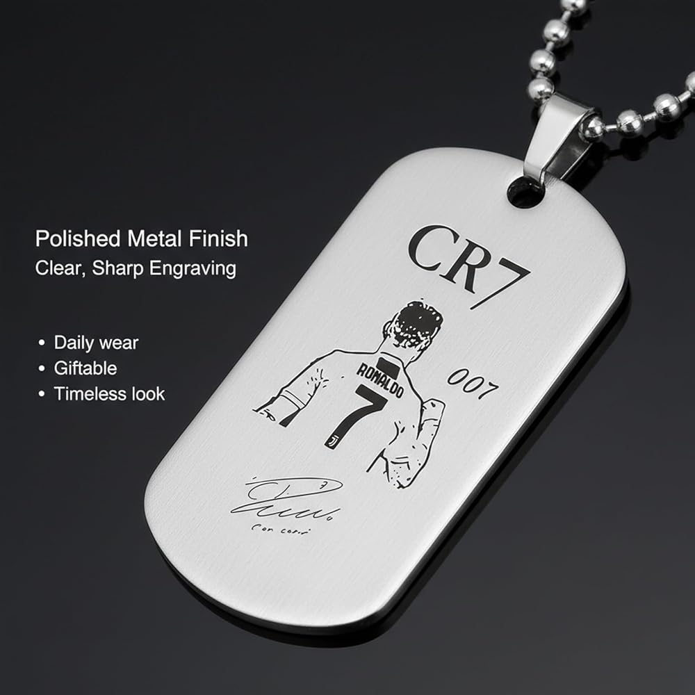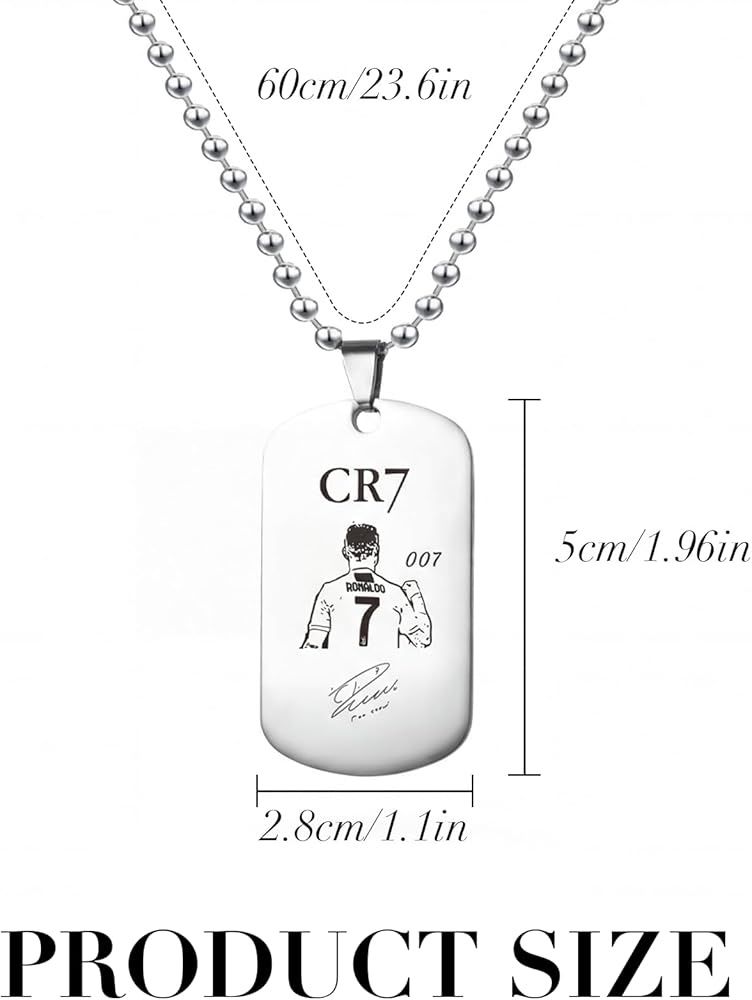 Crafted from durable stainless steel, this soccer-inspired dog tag necklace features iconic No. 7 symbols, a player silhouette, and engraved details. With a 24-inch chain and 1.57" x 0.79" pendant, it's sized for daily wear and makes a thoughtful soccer gift. Designed to honor the sport's legacy, it serves as both collectible 2026 merchandise and a memorable soccer player gift, perfect for fans celebrating the upcoming.
