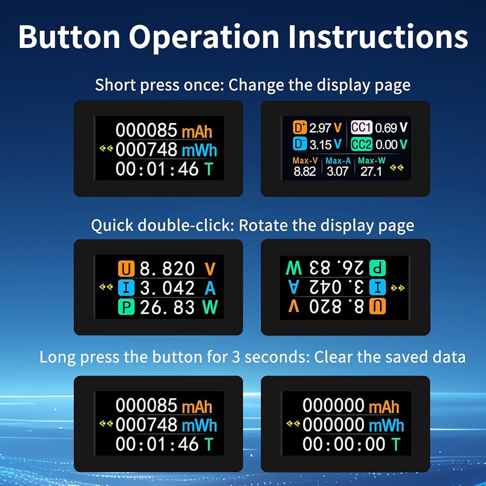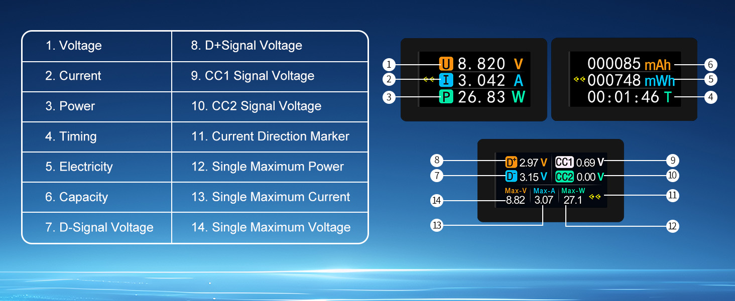 Multi-Parameter Testing Data Display: Shows voltage, current, power, fast-charging protocol, energy, and capacity statistics for a comprehensive analysis of charging performance.