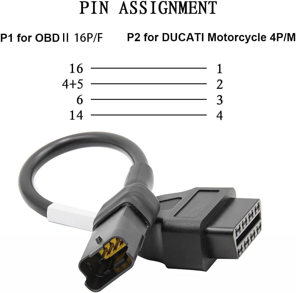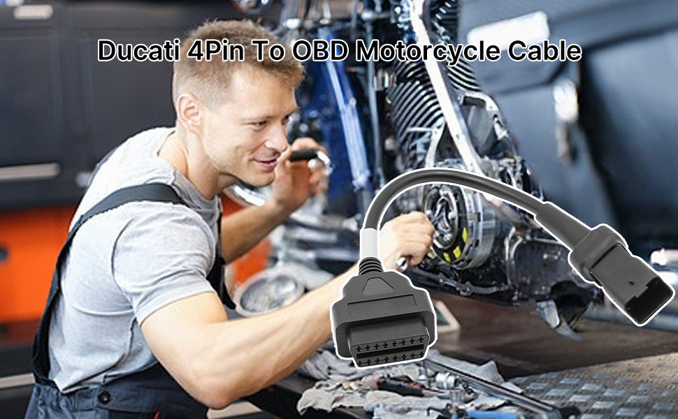 3.This 4Pin Motorbike OBD Diagnostic Adapter for Du-cati Motorcycles are easy to use, even for those who are not familiar with motorcycle diagnostics. Simply plug them in and follow the instructions. This 4pin motorbike OBD cable works with various apps and with standard OBD2 readers, convert OBD2 standard 16pin connector to required Du-cati 4pin connector.