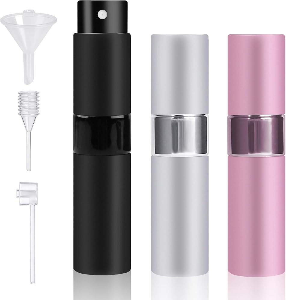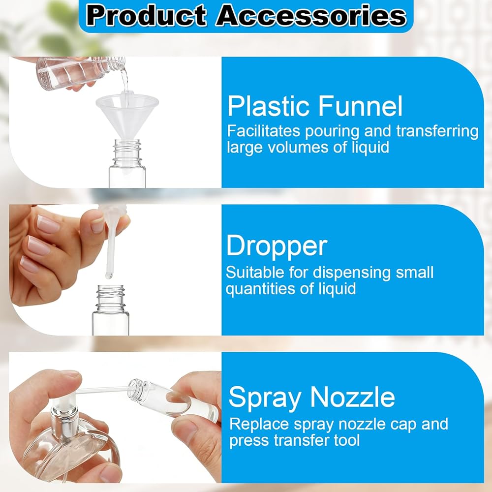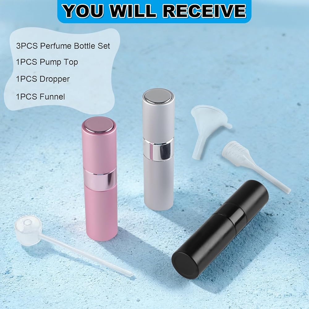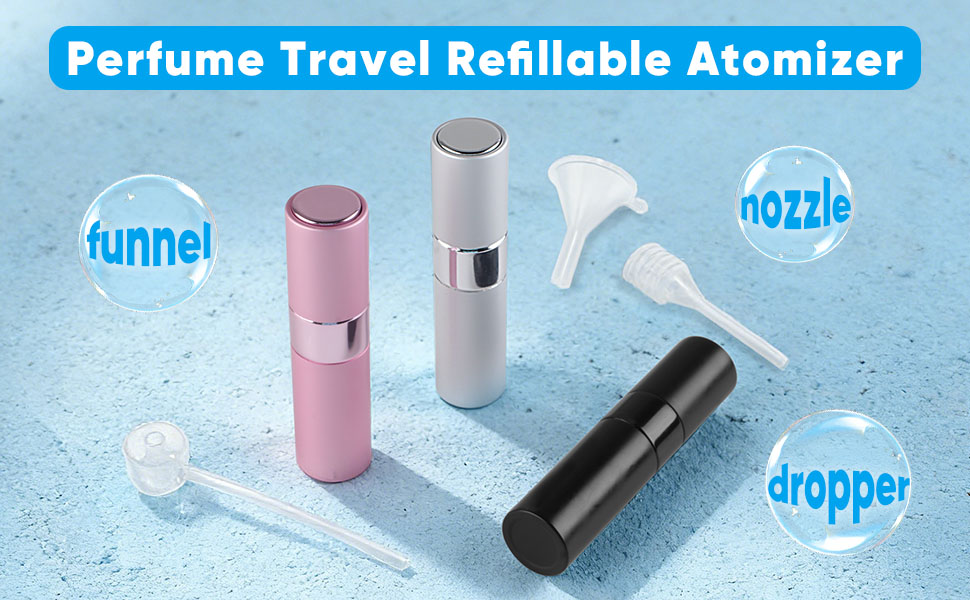 Products Include: Each set includes 3 perfume spray bottles, 1 funnel, 1 dropper, and 1 spray nozzle. This versatile design allows you to select different accessories for cosmetic filling.