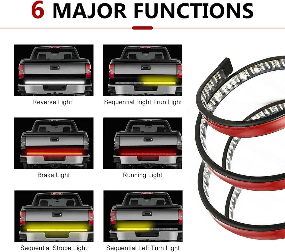Multi-functional: This LED tailgate light bar offers five different operating modes: brake mode, turn signal, hazard warning flash, and driving mode. Depending on your driving conditions, it emits lights of different colors to clearly alert vehicles behind you.