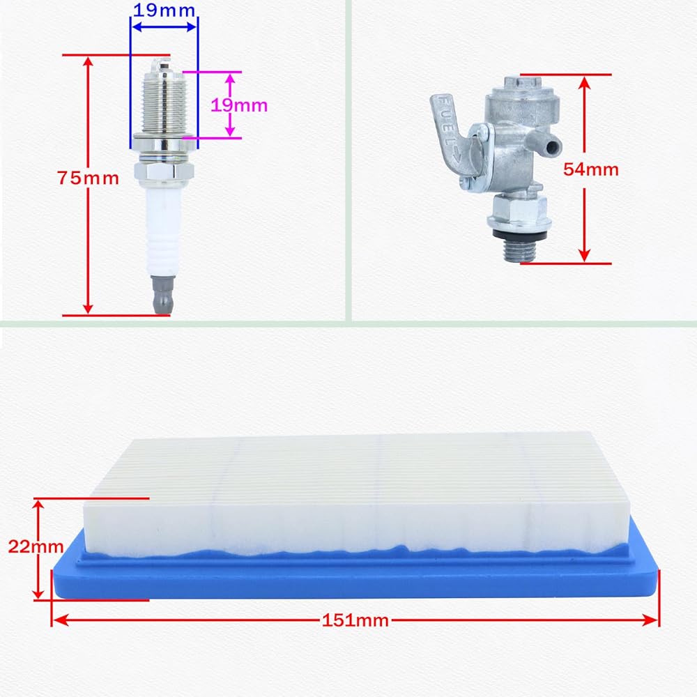 ✅Package includes 1 Air Filter Kit as the main picture shows:1 Carburetor,1 Air Filter,1 Spark Plug,1 Fuel Filter,1 Fuel Shut Off Valve,1 Fuel Petcock Valve Kits,4 Clamps,4 Gaskets.