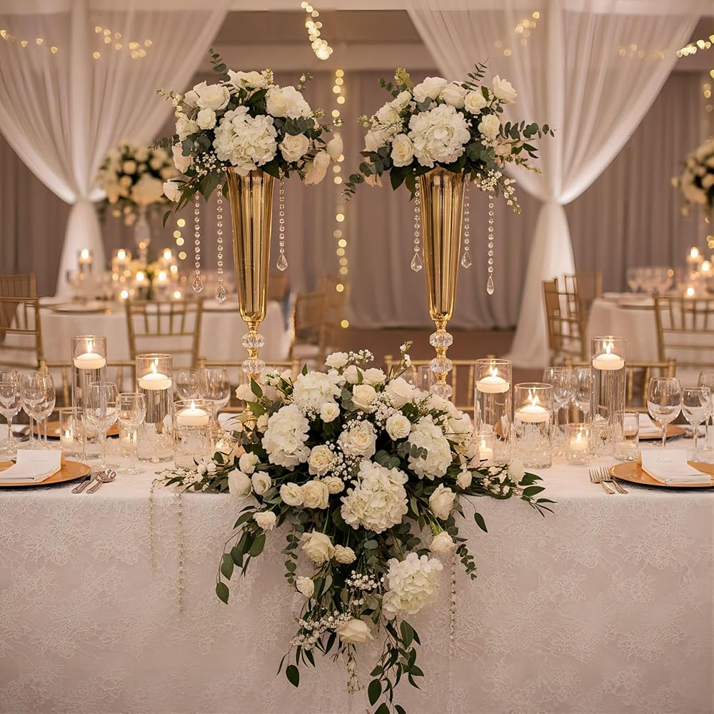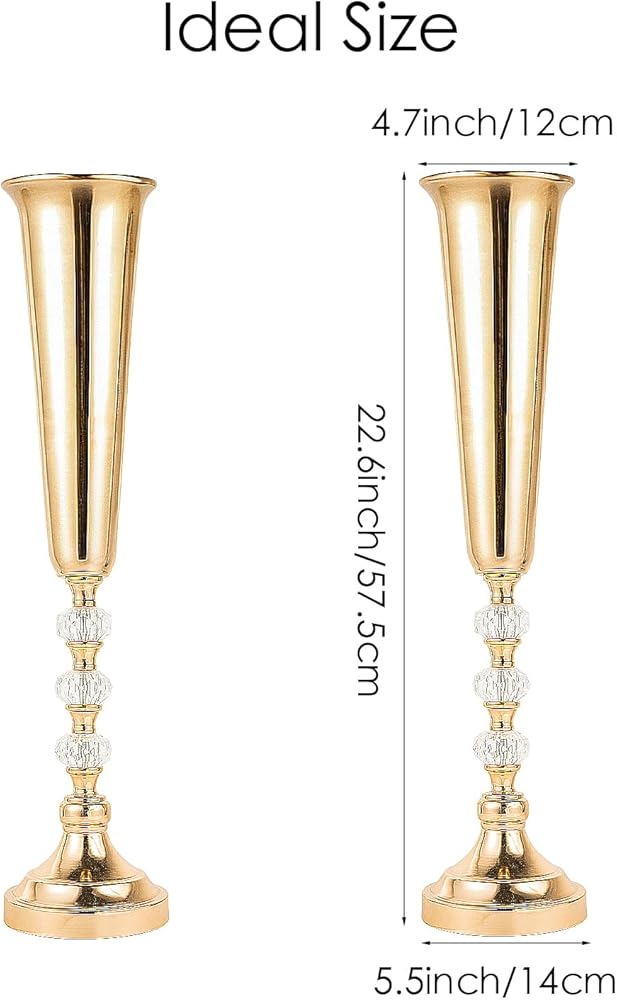 PACKAGE and SIZE: 2pcs tall Wedding centerpiece table decorations trumpet vases, Gold centerpieces vases 57.5 cm/ 22.6" high, base diameter :14cm/5.5 ", top diameter :12 cm/ 4.7 ". Artificial flowers in the photo are not included! The color is between gold and rose gold. The color of the item may be slightly different from the picture due to differences in light and screen.