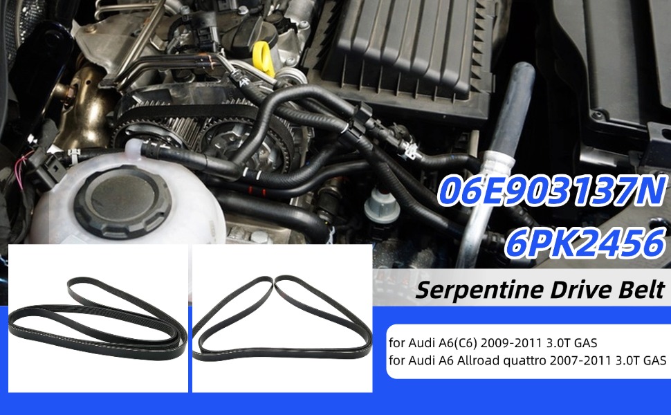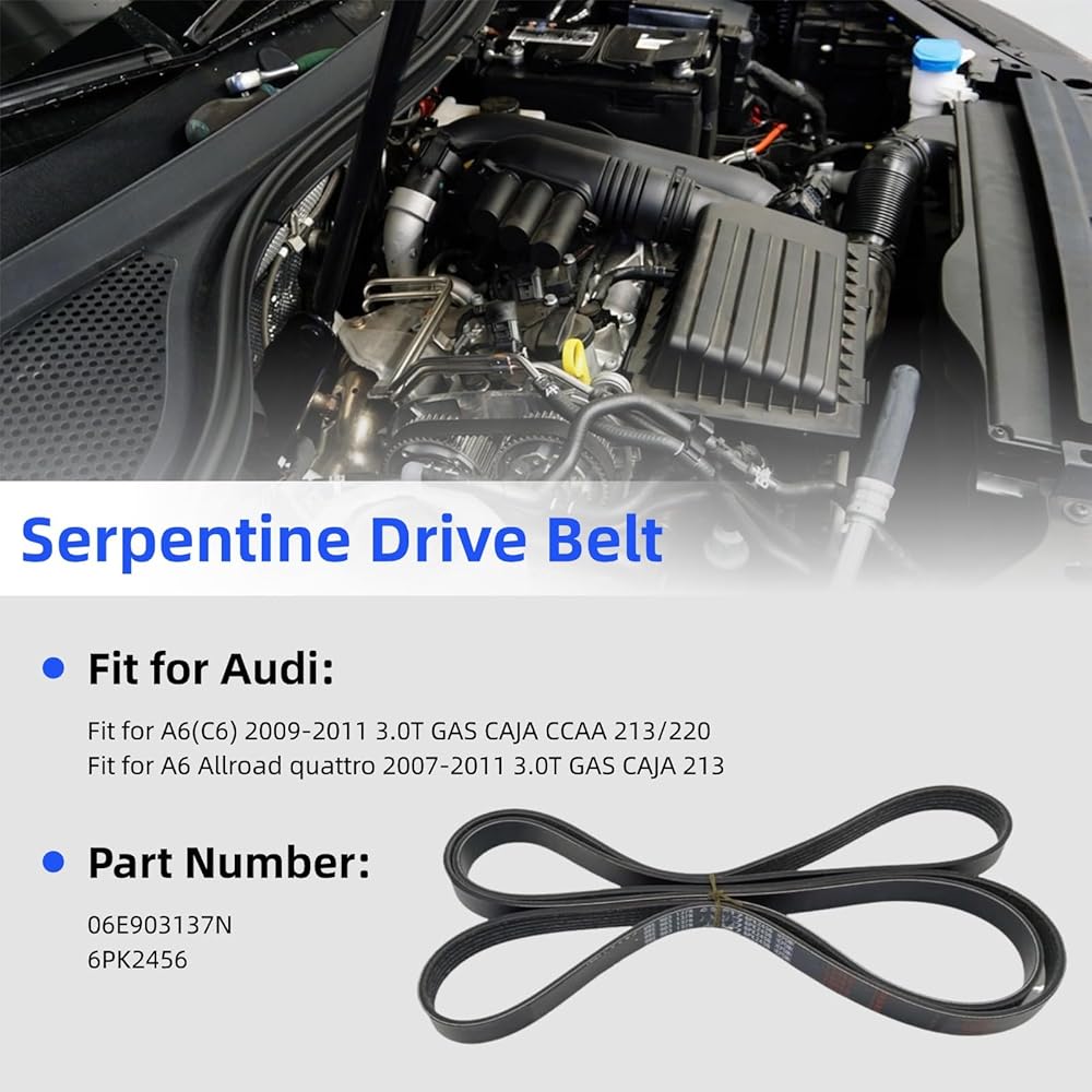 06E903137N 6PK2456 Serpentine Drive Belt Multi V-Belt Compatible with 3.0T Audi 2009-2011 A6(C6) 2007-2011 A6 Allroad Quattro