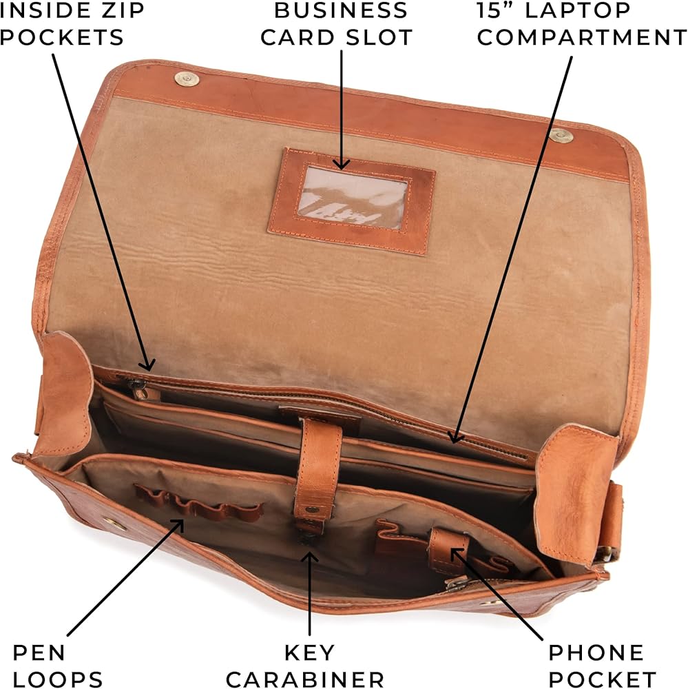 💼FOR BUSINESS & LEISURE. With the classic Ghent briefcase, you'll be able to carry all the gear you need for your day: for work, or college. This slim satchel has a reinforced 15-15,4” laptop compartment, a structured pocket for your phone, pen holders, a key ring, two large zippered pockets and and a strap to attach it to your suitcase