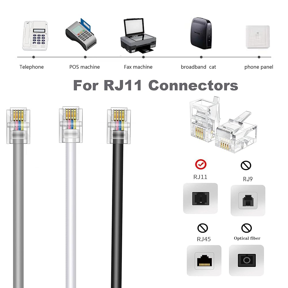 1.Standard RJ11 6P4C Design : Male-to-male modular plugs, industry-standard for 1/2 phone lines, plug-and-play for instant installation without extra tools.