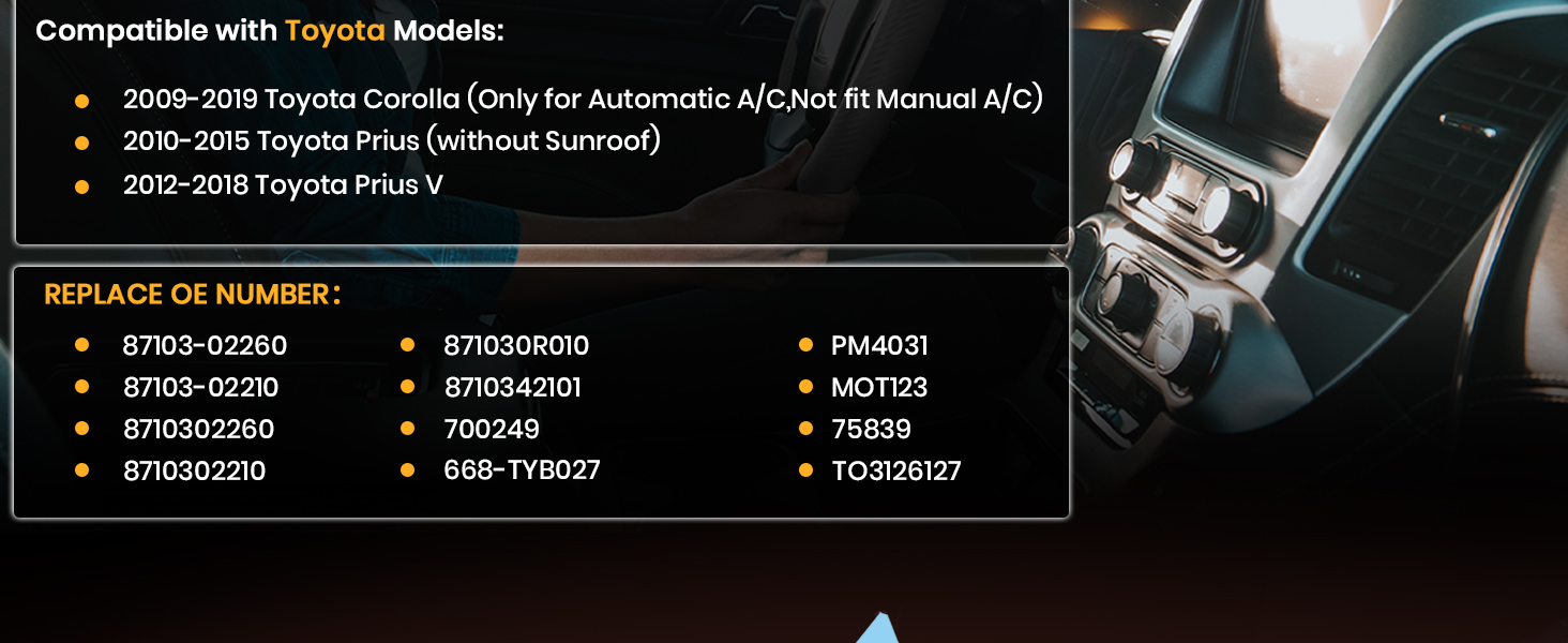 【Perfect Fit For Vehicle model 】:Front HVAC Blower Motor Compatible with Toyota models: 2009-2019 Corolla (Only for Automatic A/C,Not fit Manual A/C),2010-2015 Prius (without Sunroof),2012-2018 Prius V .