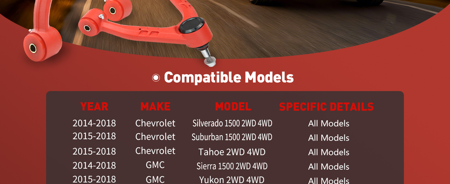 Precision Fit & Full-Travel Compatibility: Specifically engineered for 2014-2018 Chevrolet Silverado / GMC Sierra 1500 series. Effectively corrects front wheel alignment parameters (such as camber and caster) after 2-4 inch lifts, counteracting geometric changes caused by lift height to restore driving stability and reduce abnormal tire wear. If your vehicle's original control arms are cast iron (2007-2018 model years), the included tapered cap is not required during installation.