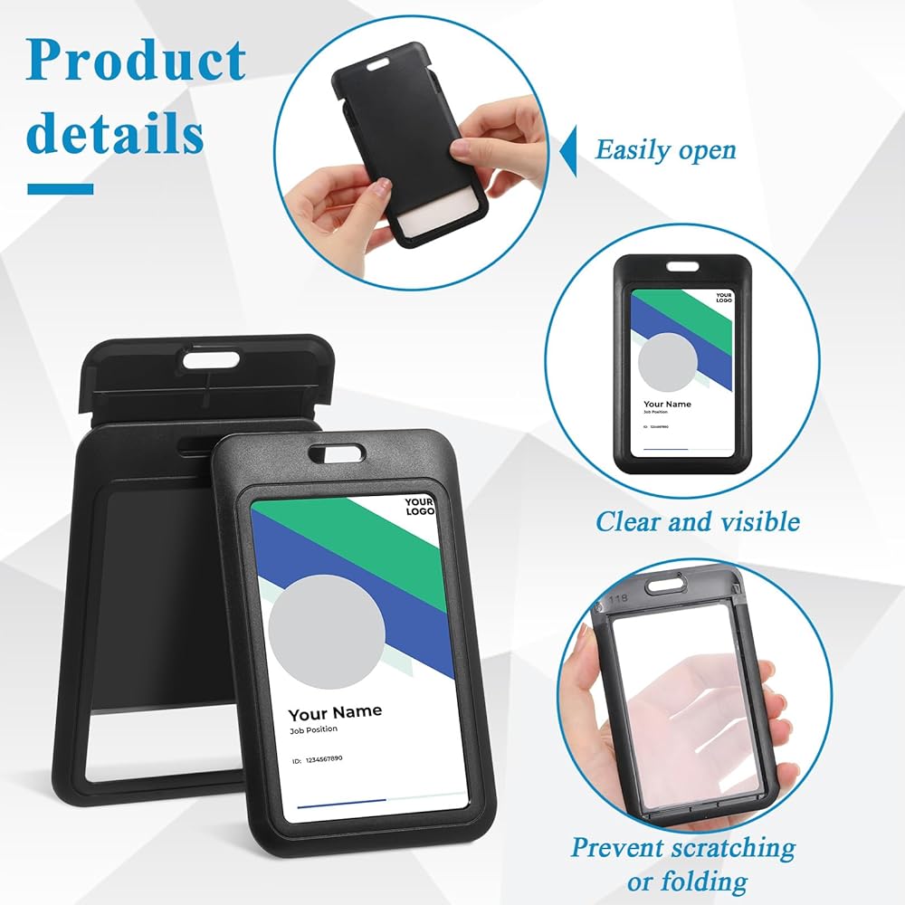 Durable Material: Made from ABS hard plastic and high-transparency PET sheet, these ID badge holders are lightweight yet robust, protecting your cards from bending, fading, and scratching.