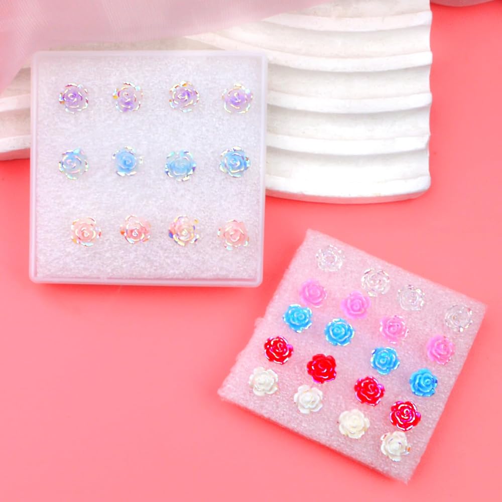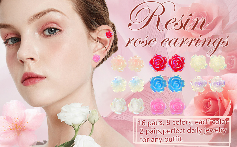 Resin Stud Earrings: You will receive 16 pairs rose flower resin earring studs(8 colors, each color 2 pairs) with silicone earring backs, diverse colors and rich quantity are enough to meet your daily needs and replacement.