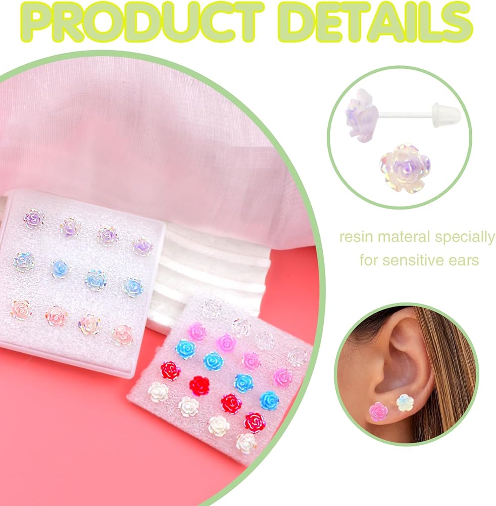 Plastic Flower Earring Size: The rose measures about 8mm, sized to fit most people's ears, the plastic resin studs are delicate and elegant to wear, and light enough to not be a burden. These hypoallergenic earrings also prevent the ear holes from closing and are safe to use during sports or surgery.