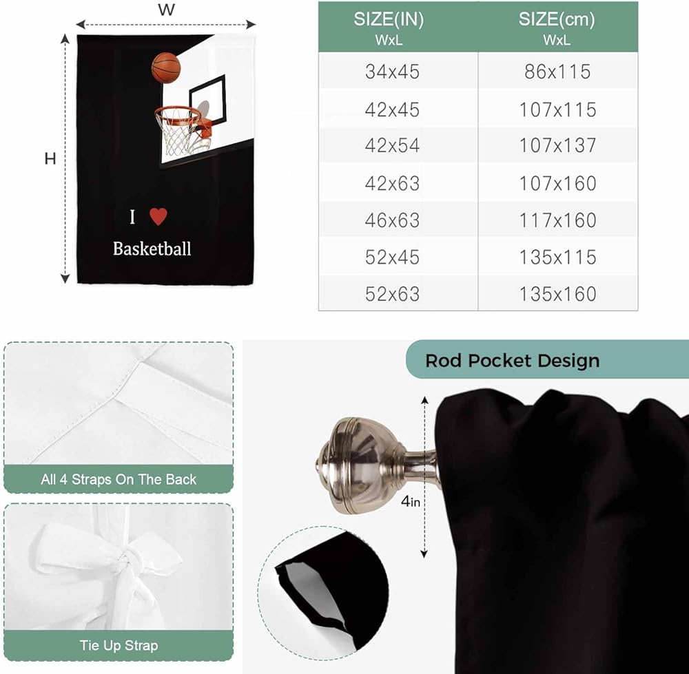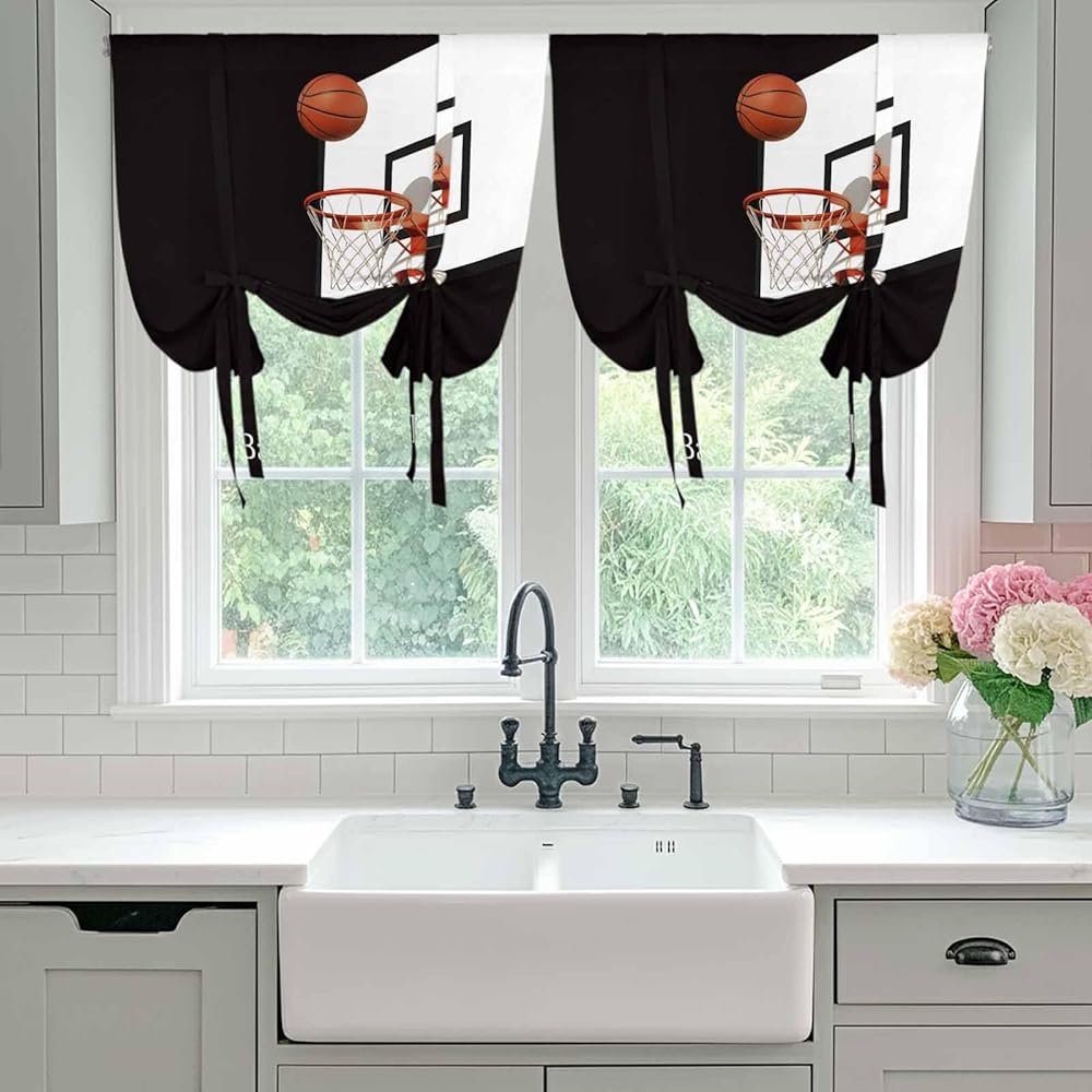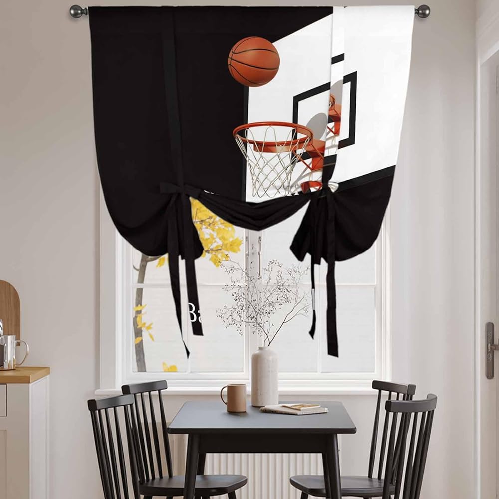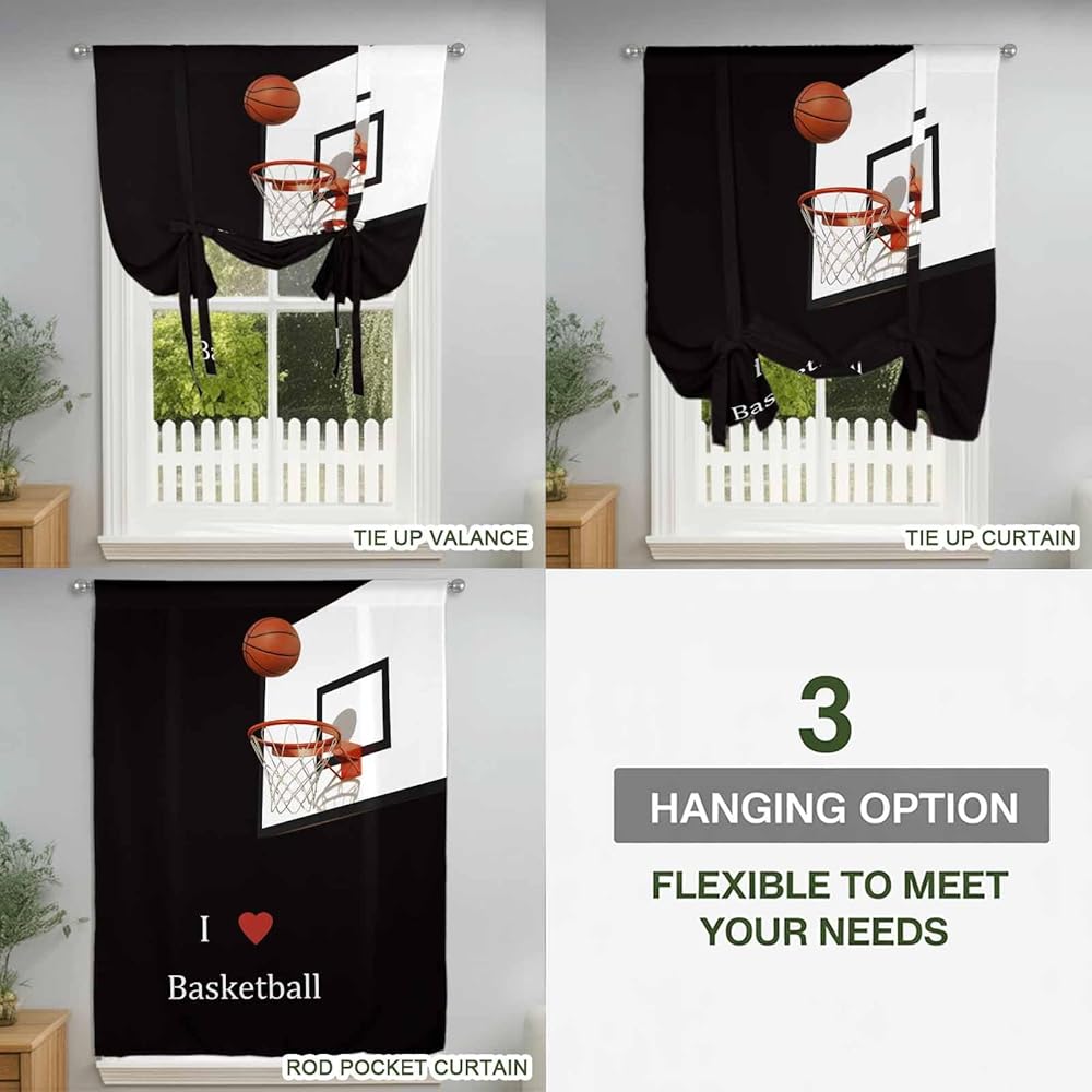 Basketball Tie Up Curtains for Window, Modern Funny Minimalist Sports Thermal Insulated Balloon Shade Adjustable Rod Pocket Curtains Valance Panels for Kitchen Bathroom Café 52'' x 63''