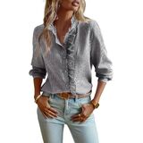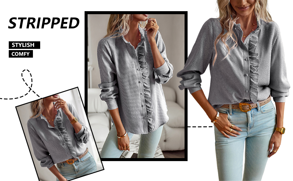 Womens Ruffle Trim Button Up Long Sleeve Blouse Top Striped Stand Collar Elegant Work Shirt