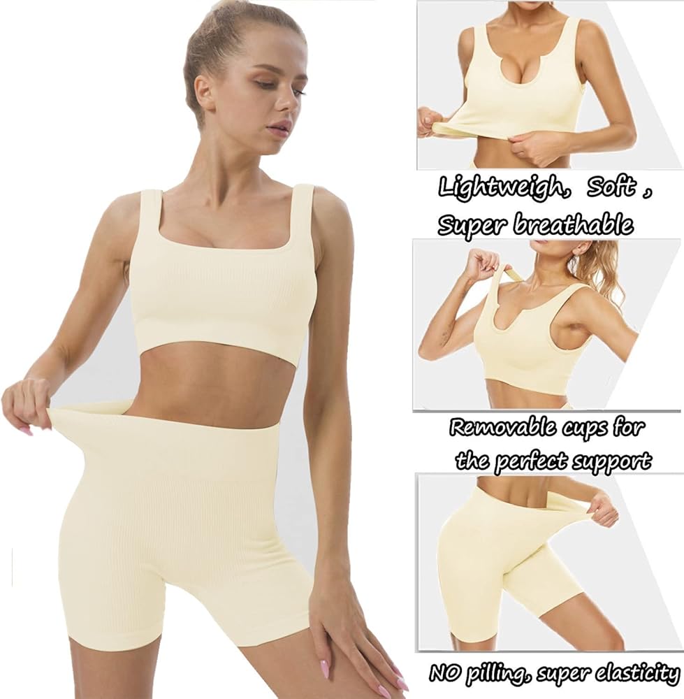 [Removable pad and wide shoulder straps bra]: The removable chest pad gives you freedom of choice and convenience of washing. Wide shoulder straps make you feel unfettered. Our ribbed workout set for women, girls, athletes, exerciser is high impact and wear-resistant.