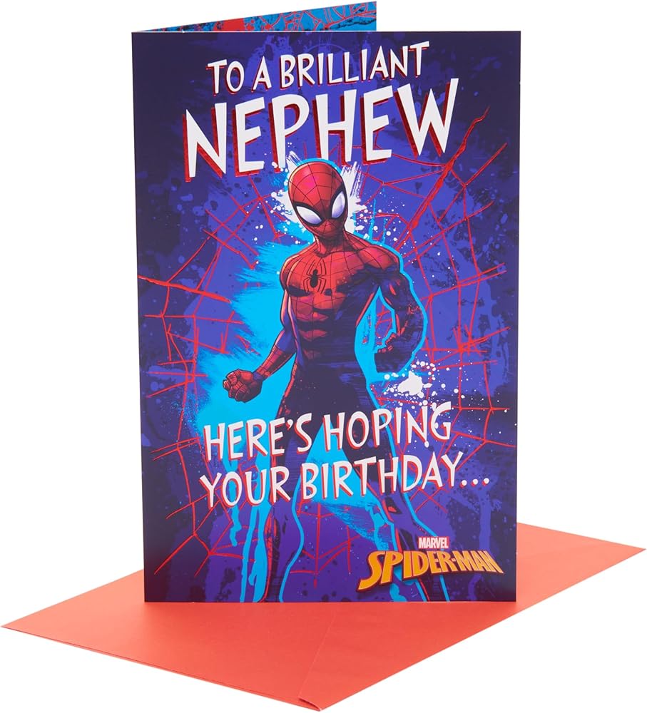 Swing in with Spider-Man and wish your nephew a happy birthday with this cool Marvel card, accented with red foil detailing.