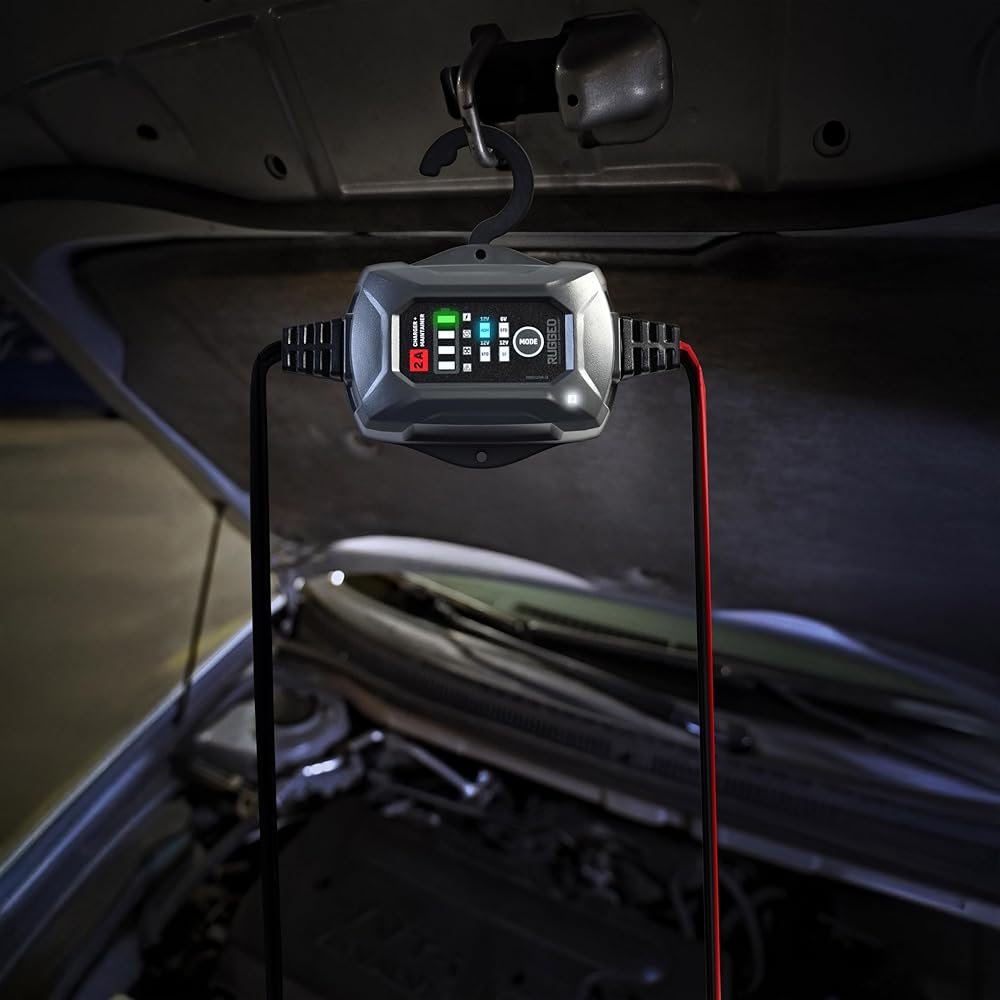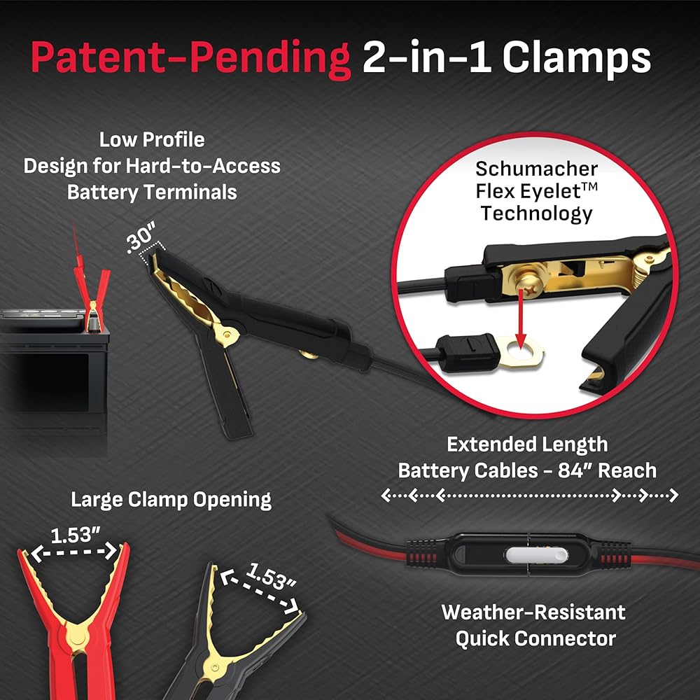 Safety and usability are at the heart of the SC1678's design. Patent-pending Flex Eyelet Technology transforms robust low-profile clamps into ring leads simply by removing a single screw, maximizing accessibility for hard-to-reach battery terminals in modern vehicles. Reverse polarity protection and spark-resistant clamps provide peace of mind, while the durable, weather-resistant casing lets users charge confidently in a range of situations. Plus, mounting holes in the case and a folding hook offer flexibility for permanent installation or one-time use.