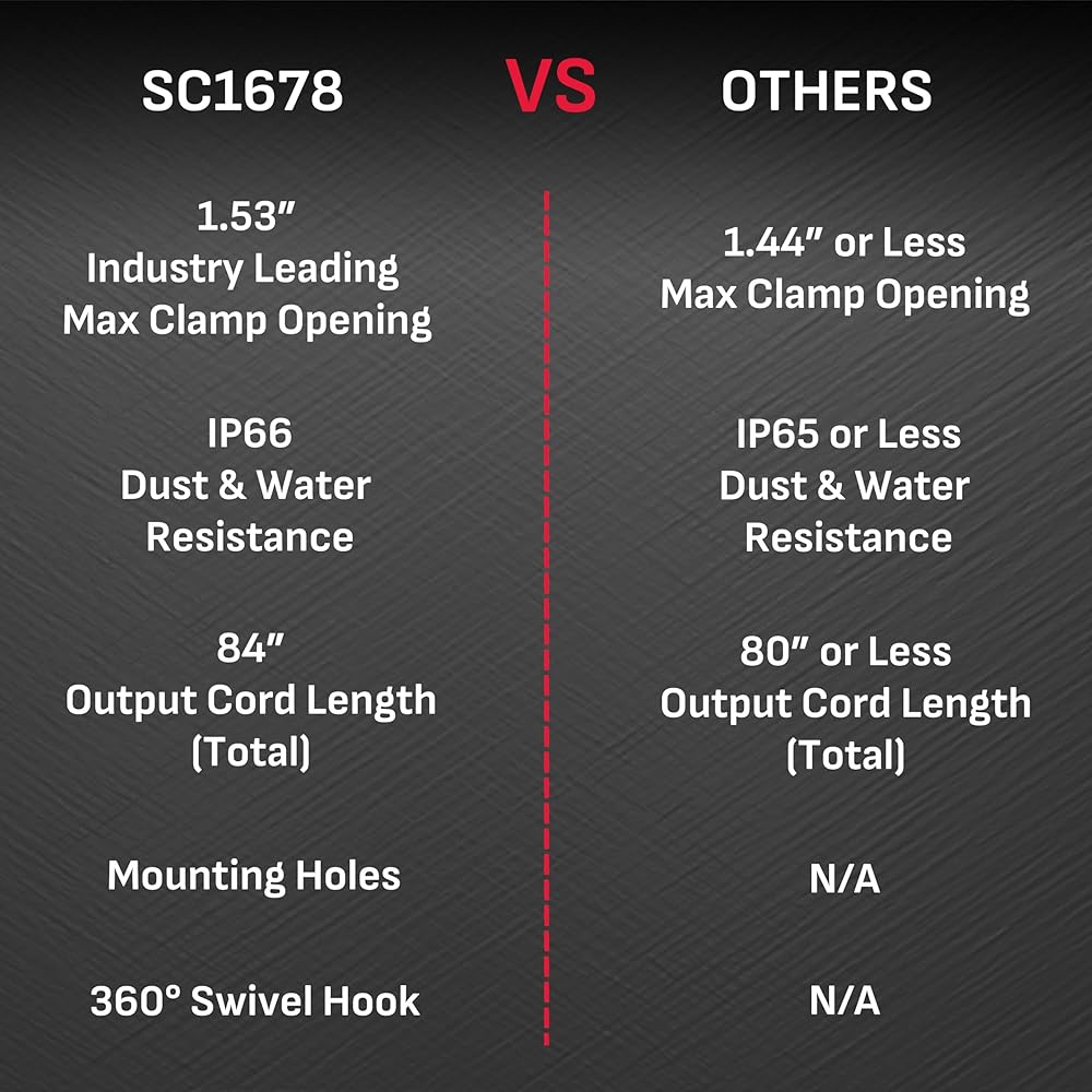 La seguridad y la facilidad de uso son el núcleo del diseño del SC1678. La tecnología patentada Flex Eyelet™ transforma las robustas abrazaderas de perfil bajo en terminales de anillo con solo quitar un tornillo, maximizando la accesibilidad para los terminales de batería de difícil acceso en los vehículos modernos. La protección contra inversión de polaridad y las abrazaderas resistentes a chispas brindan tranquilidad, mientras que la carcasa duradera y resistente a la intemperie permite a los usuarios cargar con confianza en diversas situaciones. Además, los orificios de montaje en la carcasa y un gancho plegable ofrecen flexibilidad para una instalación permanente o de un solo uso.
