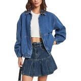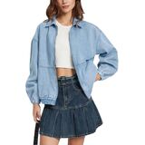 Feature: Our stylish denim jacket features bomber design, boyfriend style, collared neckline, elastic shirred hem and cuffs, side pockets, front zip up. Fashion-forward looks for spring summer and autumn
