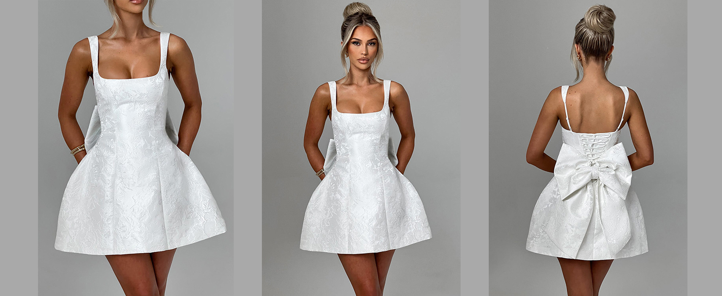 Features: Big bow in back, a-line, short, mini, corset back, puffy, square neck, sleeveless, adjustable straps, built in bra. It flatters your figure and makes you more charming at any special moment.