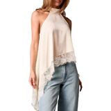 Crafted from smooth, lustrous satin (soft to the touch, with a rich drape) and accented with intricate lace trim, this top features a wrapped halter neckline (sleek, one-shoulder cutout for allure) and an asymmetrical lace hem (adds texture and movement). The relaxed fit balances structured details, flattering all body types.