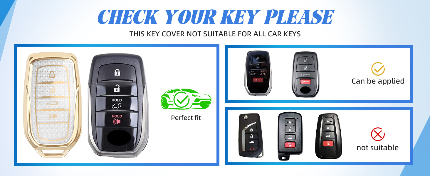 Fits Mode: Compatible with Toyota Land Cruiser,Venza,RAV4,Corolla Cross,Tundra,Grand Highlander,Sienna,Tacoma,Prius,Sequoia,Camry,Crown,Hilux,Fortuner,Mirai ,etc keyless entry remote control smart key.Before purchasing our key holder for Toyota, please carefully check if your car key is the same as the one in the second picture.