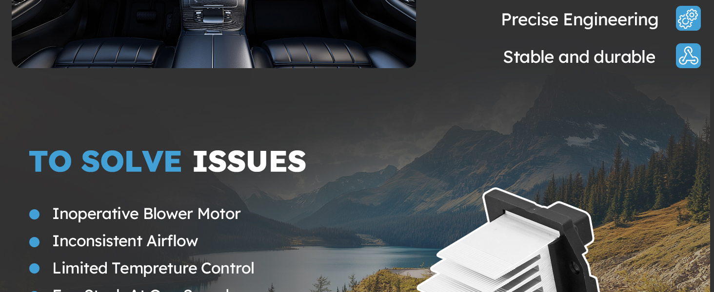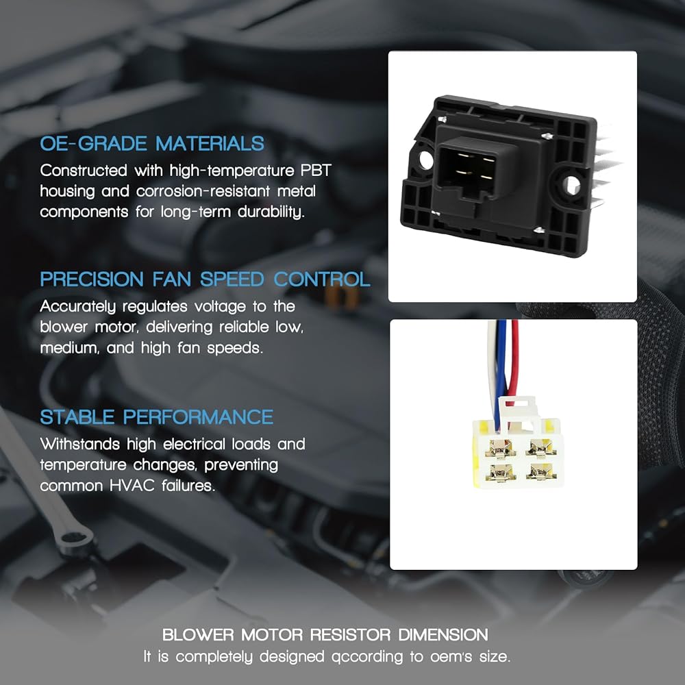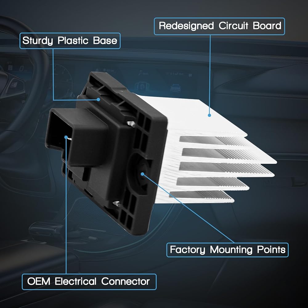 【Function】: The blower motor resistor controls the fan speed of the blower motor by changing the resistance. If your blower motor is stuck at a certain speed and the fan does not work under certain settings, the vehicle ventilation port will not blow air. This blower motor resistor can perfectly solve this problem.