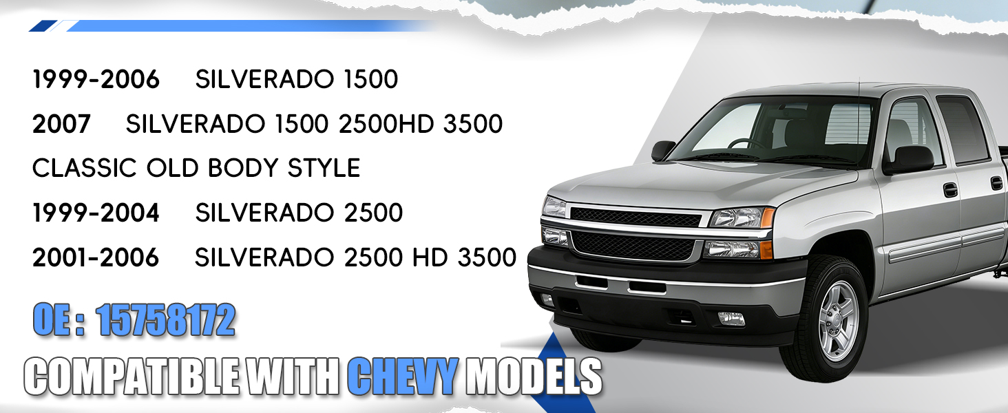 COMPATIBLE WITH : Compatible with Chevy 1999-2006 Silverado 1500, 2007 Silverado 1500 2500HD 3500 Classic Old Body Style, 1999-2004 Silverado 2500, 2001-2006 Silverado 2500 HD3500, with GMC 1999-2006 Sierra 1500, 2007 Sierra 1500 2500HD 3500 Classic Old Body Style, 1999-2004 Sierra 2500 HD, 2001-2006 Sierra 2500HD 3500.