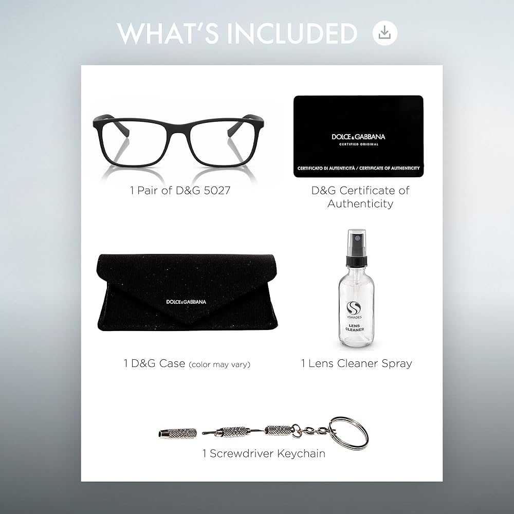 - Packaging Includes: Dolce & Gabbana protective Eyeglasses Case, Assurance Booklet, D&G Logo Microfiber Cleaning cloth