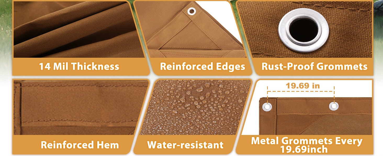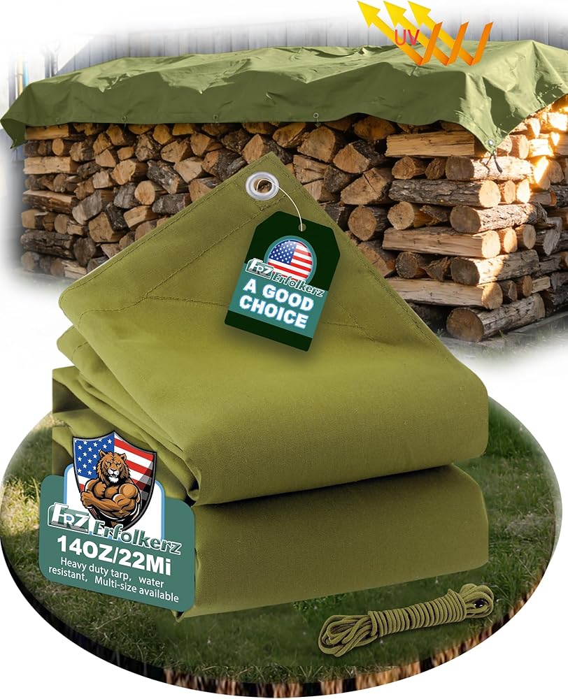 WATER-RESISTANT & BREATHABLE: Built from 14OZ heavy-duty canvas, Erfolkerz Tarp is sturdily designed and breathable. At 22 mils thick, it features an advanced organic fluorine silicone water-resistant coating, offering improved performance over traditional wax-treated tarps and reducing humidity. The canvas has a 5cm hem on all four sides, which strengthens the tarpaulin's resistance to tearing.