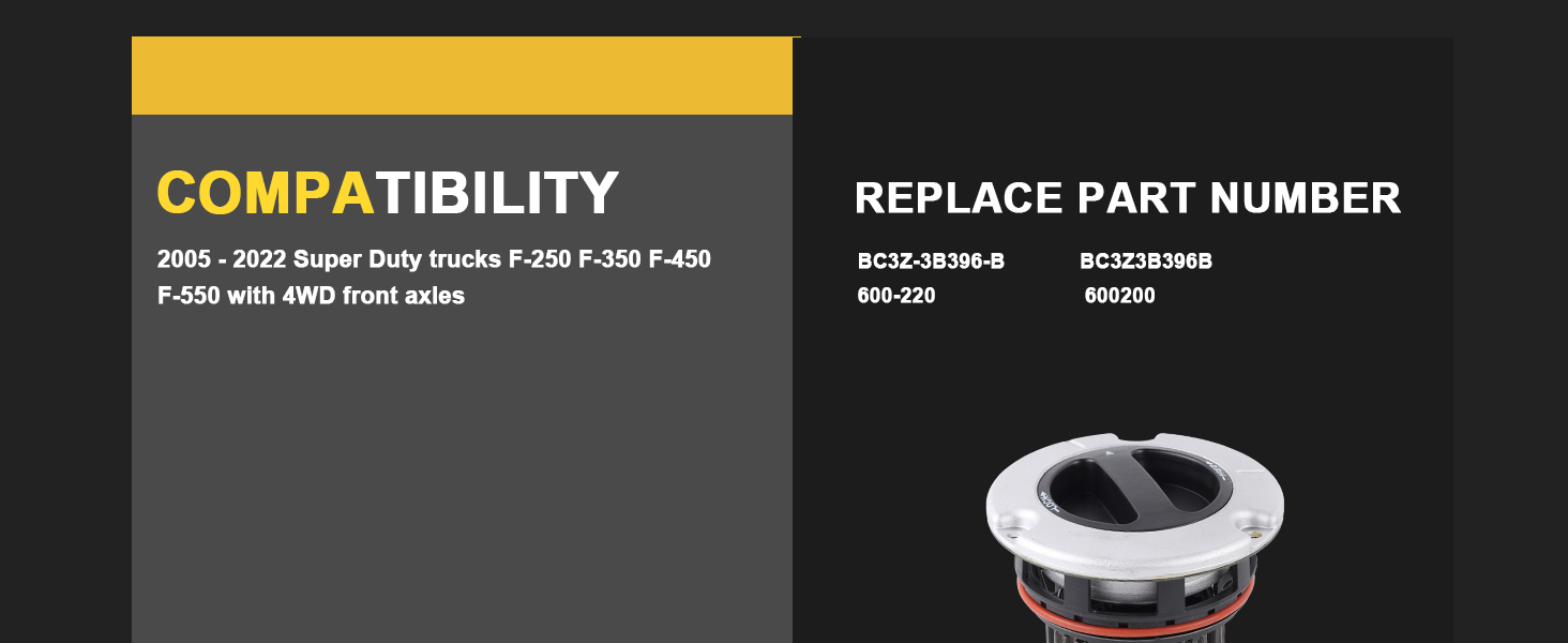 【Compatible Models】This manual locking hub assembly is a direct replacement for Super Duty trucks including F-250, F-350, F-450, and F-550 from 2005 to 2022 with 4WD front axles