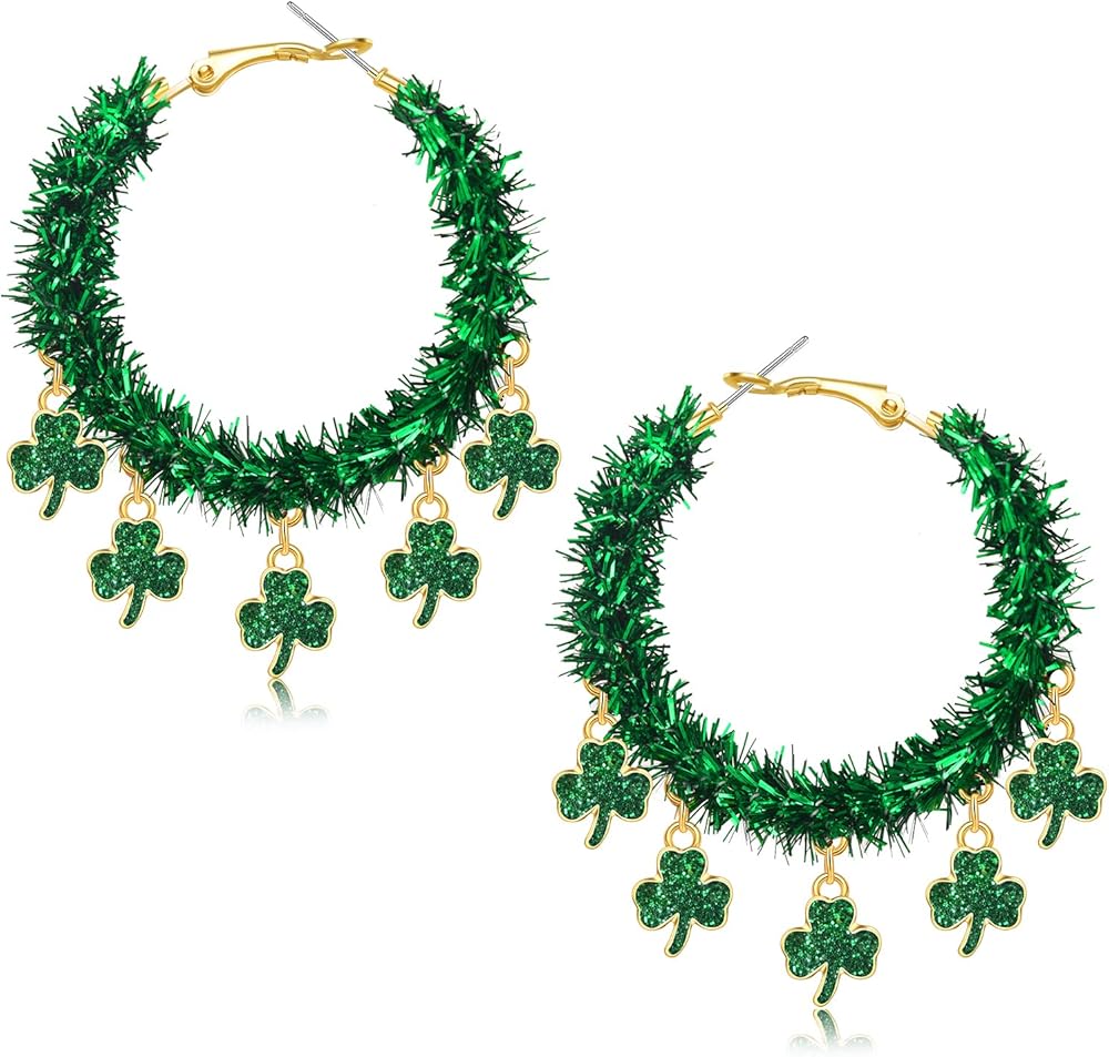 Top off your Irish parade ensemble with this sparkling St.Patrick's day hoop earrings for women and head out for a day of green beer and Irish fun.these St.Patrick's day earrings Featuring a high polish hoops wrapped with green glitter sequins and adorned with shamrock and hat charms dangle.Brighten up your St.Patrick's Day outfits and evoking the celebrity in everyone with our St.Patrick's day shamrock hoop earrings,while bringing you good luck and fortune!