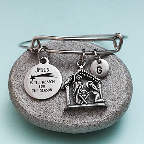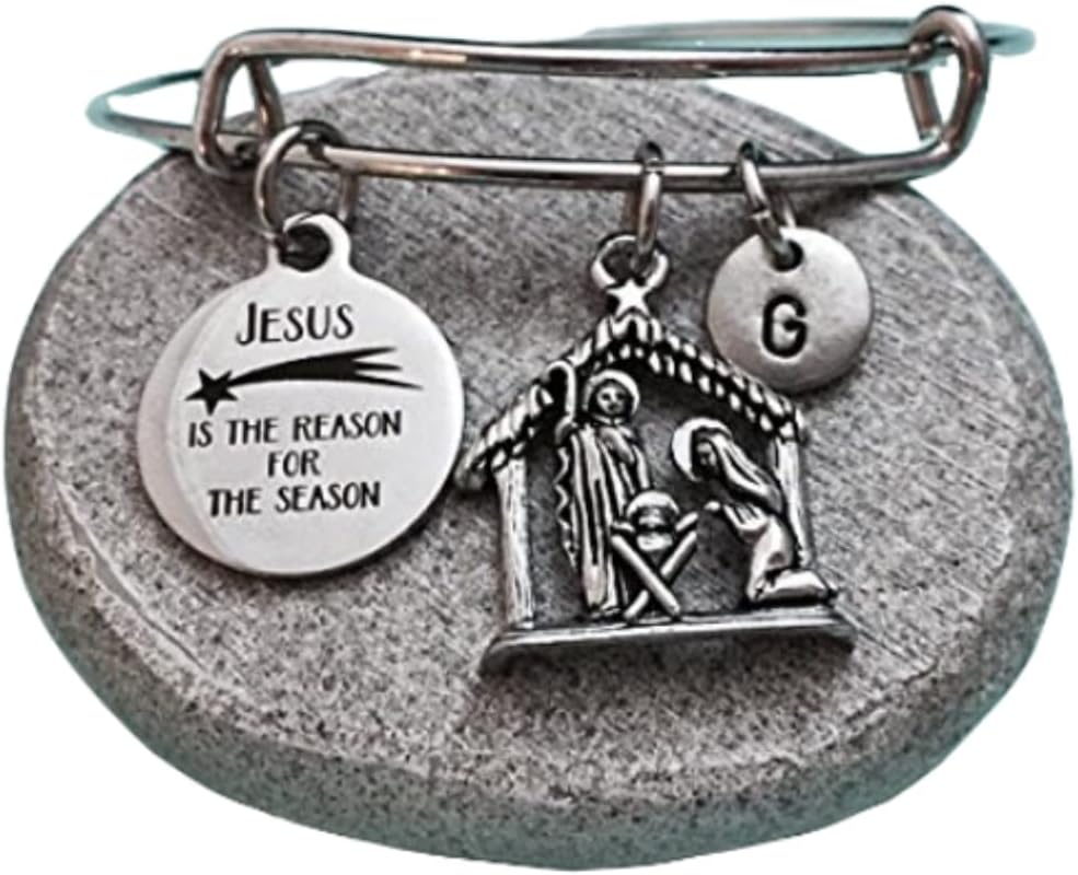 A Christmas charm bangle bracelet with hand stamped initial *Bracelet is adjustable *Initial charm is antique silver pewter 9mm *Christmas charm is antique silver pewter *Your purchase will arrive packaged in a cute gift box and I will include a message by request.