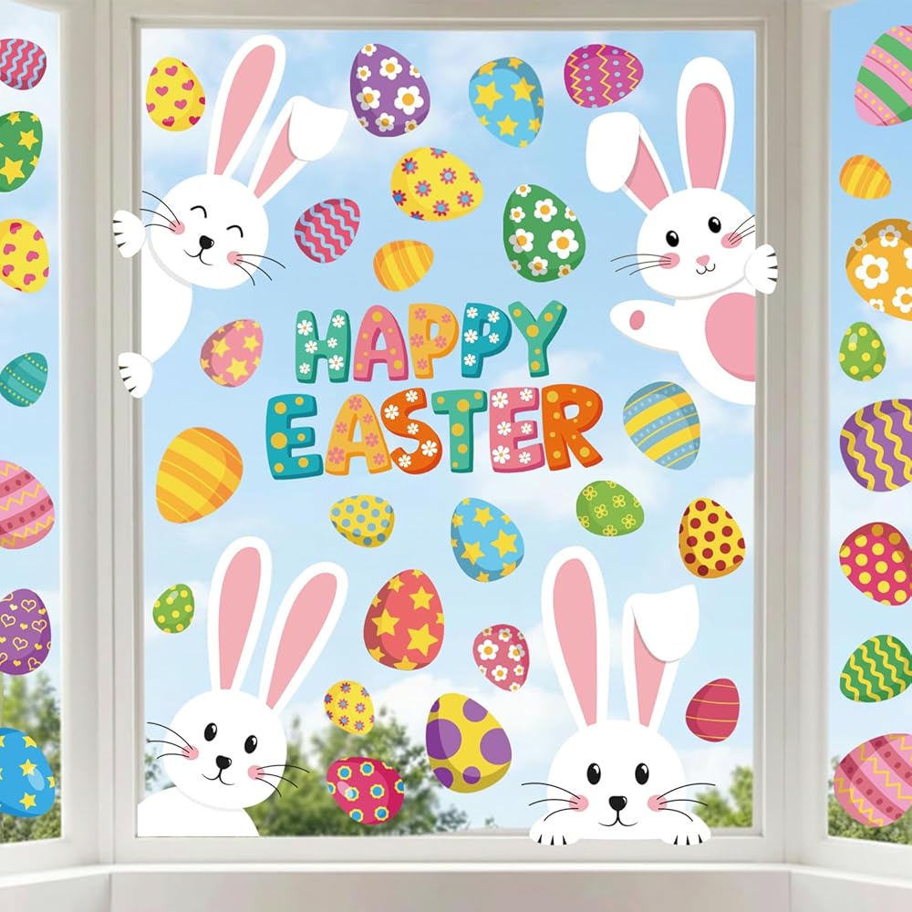 Bring instant Easter cheer to your windows with this colorful Easter window clings set. Featuring adorable bunnies, vibrant patterned eggs, floral accents, and playful “HAPPY EASTER” lettering, these designs turn any plain glass into a bright and joyful spring display.