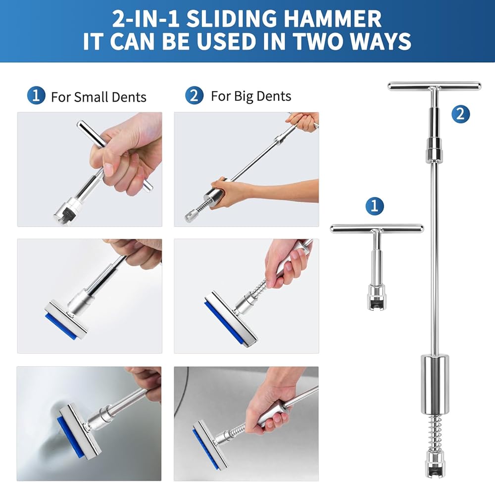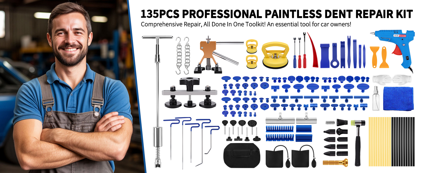REPAIRS DENTS OF ALL SIZES: Our dent remover tools for car are suitable for all different sizes of dents. The Gold dent lifter is suitable for small dents. The Bridge Puller is fit for medium dents. 2-in-1T-Bar Puller is used to repair Large dents. Also, it can be disassembled into a short T-bar puller for use, which is very convenient and effective.For uneven small dents, you can use a rubber hammer and a leveling pen, suction cups can be used for large and small dents.It comes with 80 pull tabs needed to repair dents of any size or shape. Liwogi 135pcs Dent Removal kits can meet kinds of need.(Please read the manual before use)