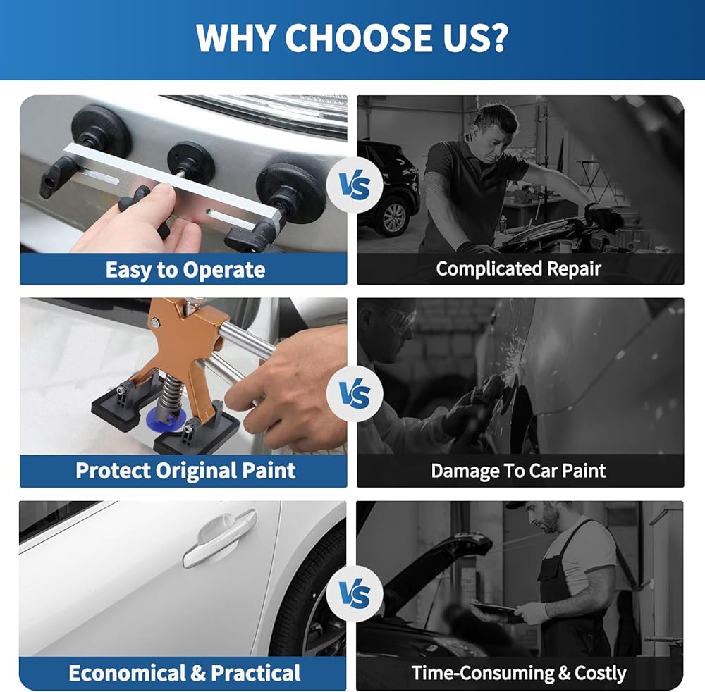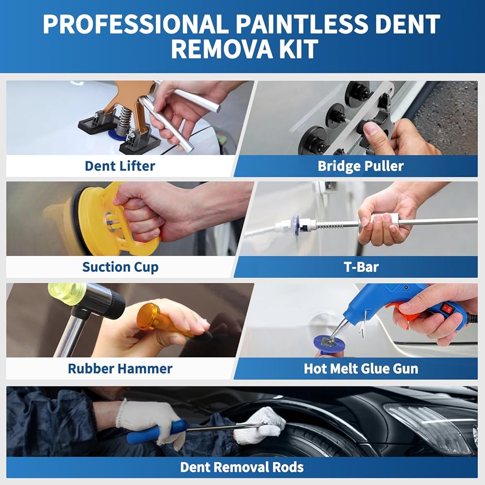 TECHNICAL SUPPORT: Please carefully read the product instructions and manual before use. If you have any questions about our car dent remover kit, feel free to contact us. We offer professional customer service 24 hours a day, 7 days a week. Tip: Most parts of the car body can be repaired, except for the vehicle frame position, paint touch-up position, and dents with a diameter of less than 0.2 inches
