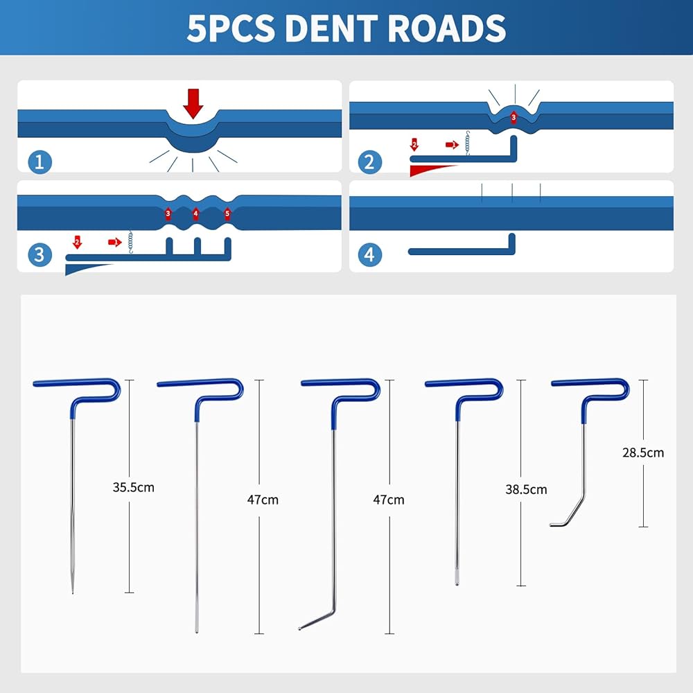 5PCS DENT REMOVAL RODS:There are 5 rods of different sizes.Different shaped heads are available for all types of dent repairs. Each has a different amplitude and can be perfectly repaired according to the dents on the bodywork to help you easily remove dents and become the most effective assistant. The rods are made of stainless steel. Ergonomic pliers can be designed to save labor and easy to lift, it is very sturdy and zero damage to your cars' surface